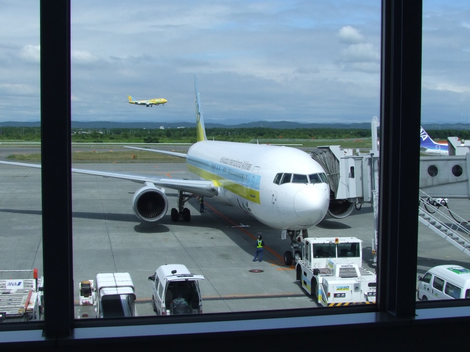 乗った飛行機は、北海道ツアーではお馴染みの北海道国際航空(エア・ドゥ)という航空会社です。今回の機材はボーイング767-300ERという種類のもので、機内の座席の並びが、2列・3列・2列…となっていたのですが、そのど真ん中の3列の部分に、自分達3人が並んで座っているのが個人的にはツボで(笑)、何だか面白い時間でした。逆に言えば、外の景色が眺め辛いのが残念ではありましたが、新千歳空港までは約1時間半の道のりです。ビールを飲んでいる身にとっては(池田君以外)あっという間の時間です。
