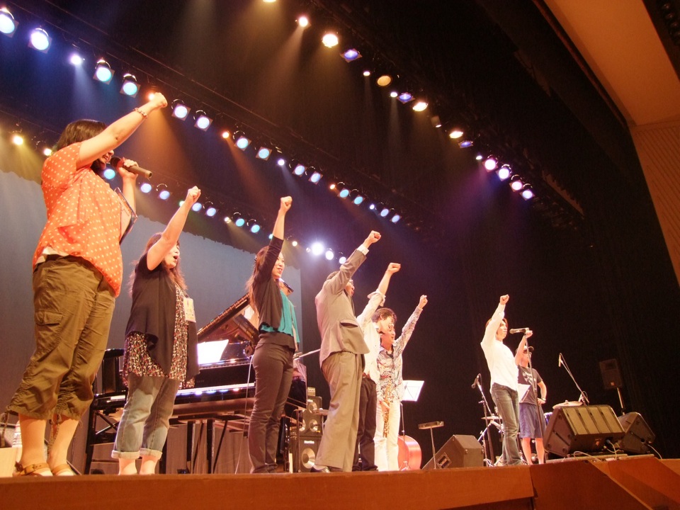 …と言うのは、この“New どさコン”の主旨として、東京から若いバンドを呼んで、その代わり伊達の街のPRをさせる役目を遣わせ、伊達も東京も元気になっていこう!…みたいな主旨?があって、その合言葉として「さあ、元気出して行くべさ!」と言うと「オー!」…という掛け合いの儀式?が存在するのです。その第一声が自分に任されているので、ここは責任重大です…。そのポーズも指定されていて、左手をグーにして腰にやり、そして右手もグーにして、天高く突き上げるような感じです。…という事で、初めてだったので、ぎこちない感じだったのは置いておくとして(笑)、何とか大役を務める事が出来ました。さあ、演奏にいきましょう…。