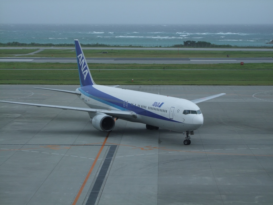 そして、反対側の遠くの方から飛行機のライトらしいものが目に入り、フラフラしながらも那覇空港に近付いてくる飛行機が見え始めました。…来ました。今度自分が乗る機材であるボーイング767‐300型です。後は無事に着陸してほしいと願うばかりでしたが、流石のANAと言いますか、台風からの風をものともせず、安定した着陸を見せてくれました。この時点で自分はやっと、どうやら無事に沖縄を飛び立てそうだと確信を得たものでした。