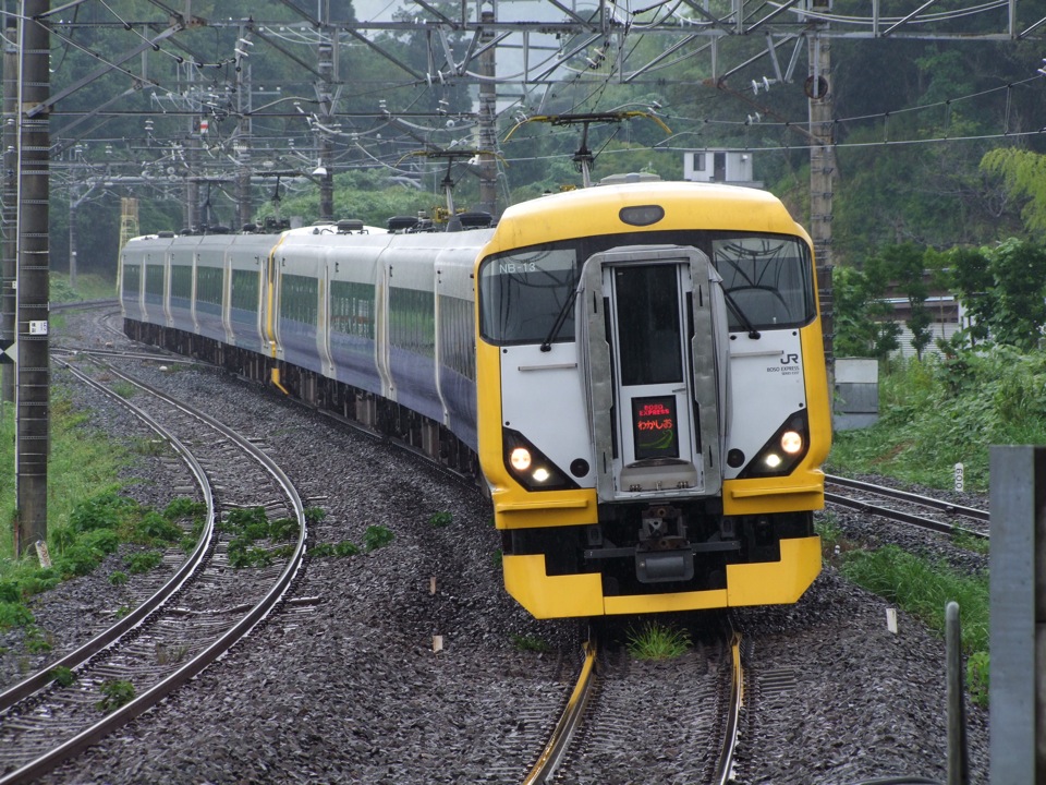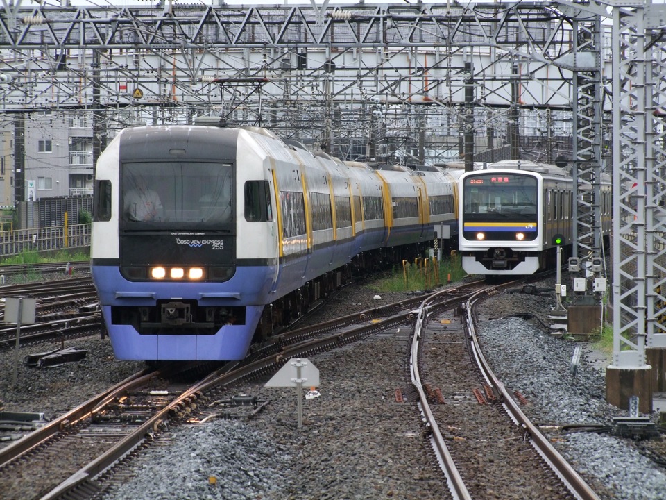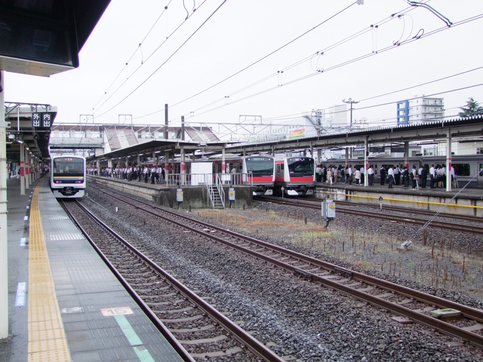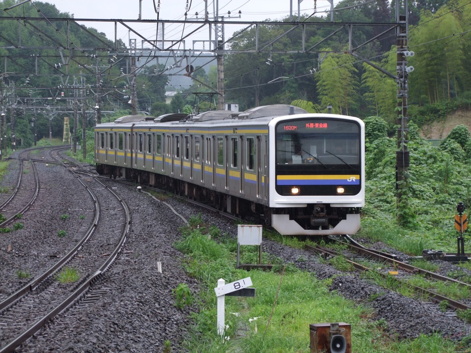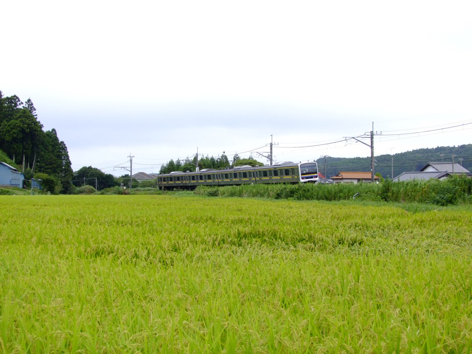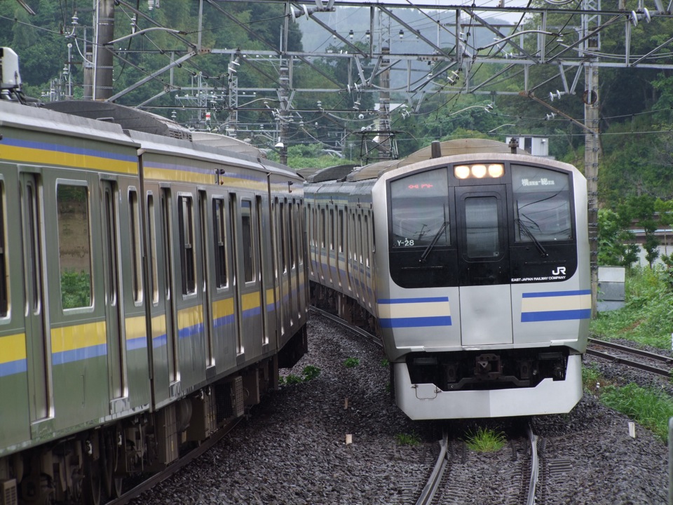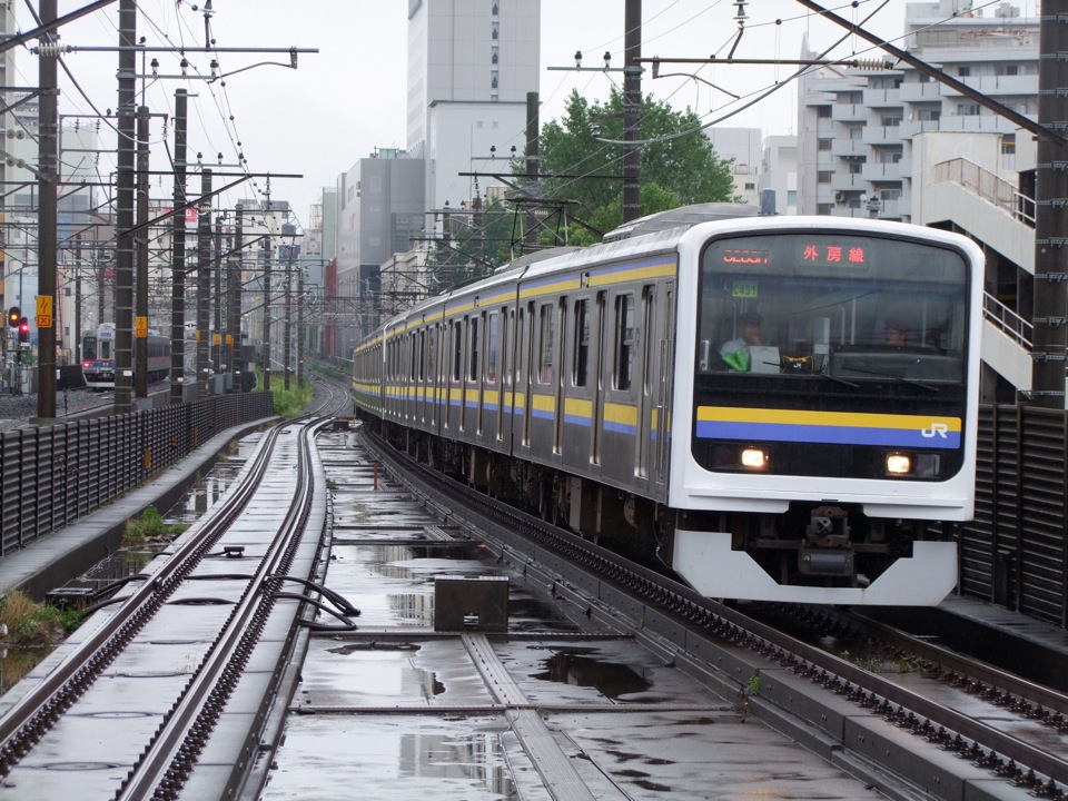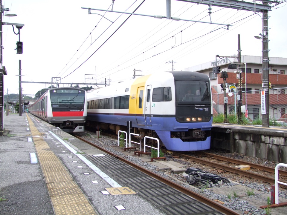 それ以外として、特急列車は概ね1時間に1本という感じで、朝夕にはこれに、横須賀・総武快速線からのE217系(右上写真参照)も顔を出してきます。外房線の列車の両数は、4両編成から10両編成が一般的なのですが、こちらの快速は15両編成で走っている事も多く、列車によっての両数の差は大したものです(笑)。