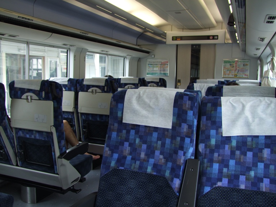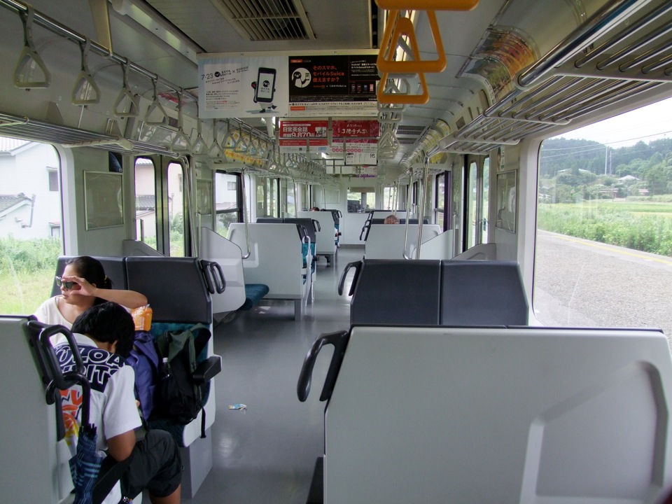 ここからは単線区間になる…と言いましたが、まだ各所で複線区間になる所もあり、運転本数は少ないものの、途中で特急列車の通過待ちを行う普通列車も見られます。この辺りですと車内の乗客はチラホラ…という感じで、夏休みの時期にしては寂しい感じではありますが、この日の天気を考えると仕方ないのかもしれません。つまりはそろそろ海も近付いてくる頃なのですが、外房線は暫くは海とは1kmぐらいの距離をとって走るので、車窓から海を確認するのは結構困難だったりします。
