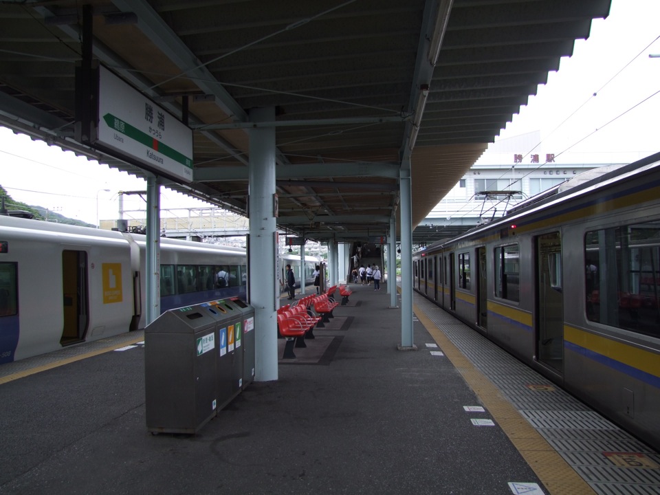 また浪花駅に戻り、一路南へと進みます。海水浴で有名な御宿駅を過ぎ、列車は勝浦駅に到着しました。1日1往復ですが、この駅まで京葉線の直通列車は設定されており、東京駅までの所要時間も2時間10分くらい(しかし、上総一ノ宮駅で20分くらい停車し、この駅で1つ前の列車に乗った方が早く着きます)なので、勝浦も意外に便利な場所なのかもしれませんね(ちなみに、都心から普通列車で約2時間の距離と言うと、群馬県の前橋辺りになります)。