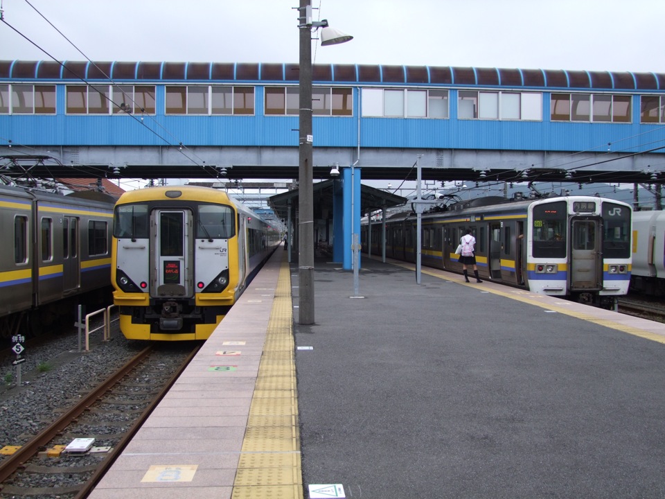 外房線を走る特急“わかしお”号は、東京駅を出発し、殆どが京葉線経由でここまで来て、そして外房線へと入っていきます(また、内房線に入る“さざなみ”号という特急列車も設定されています)。運が良い?と、左上写真のように、千葉駅からの列車と同時並走が見られるかもしれません。それにしても、京葉線の車両は殆どが233系に変わってしまい、約1年前に“さんぽ”をした時〔鉄道さんぽ 3.(JR東日本、京葉線編) 参照〕と、車両の様子が大分変ってしまいました。あんなにバリエーションのあった車両陣はどこへやら…という感じです。こちらにも既に時代の波は訪れているようですね。