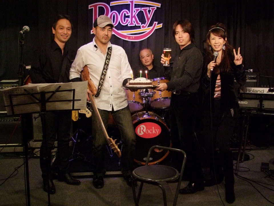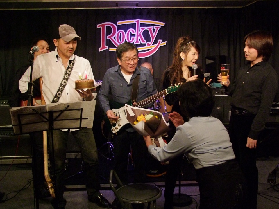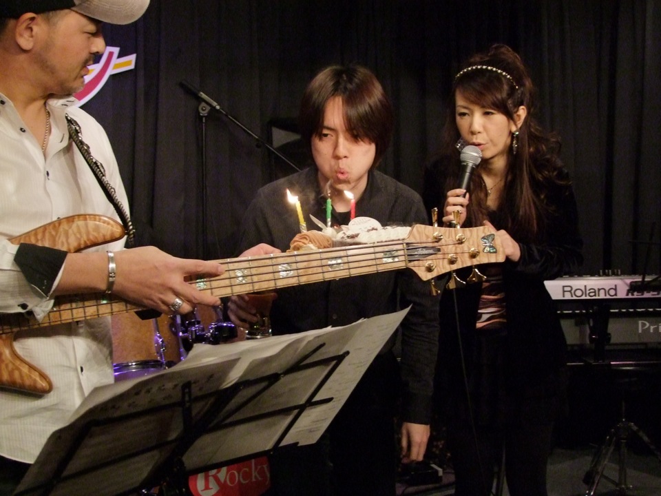 実は自分、今月の29日に30歳の誕生日を迎えるのですが、それを恭子さんが1ステージ目のMCの時点で気付いたみたいで、確かに、いま思い出した…みたいな感じでした。そしたら、なんと3ステージ目の途中には、ケーキ等の催し物が用意されていたではありませんか!…実はこの間にお客さんが用意して下さったようで、ケーキにも蝋燭が3本立っていて、バースデー・プレートには、マジックで(ん?)“スケさん”(ここでは自分は、バンド・メンバー、お客さんを含めて“スケさん”と呼ばれているのです)と書かれています。実際のところ、まだ誕生日は先なのですが、本当に嬉しかったです。どうもありがとうございました!
