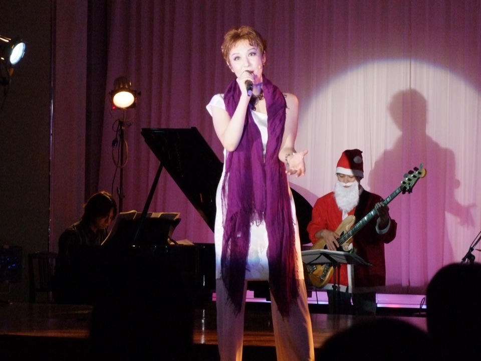 そんな中、演奏者側でも色々と攻めの姿勢が見られました。特に印象的だったのは、ベースの大森さんが途中でサンタになった事です(右上写真参照…笑)。まあ、見ての通りなのですが、これが途中のMC中にこっそりと行われていた事が愉快ではないですか(笑)。実際、夢輝さんがその事に気付いたのは最後のMC中でしたし。…とは言え、勿論それ以外の工夫も色々行われていたと、付け加えておきます(笑)。