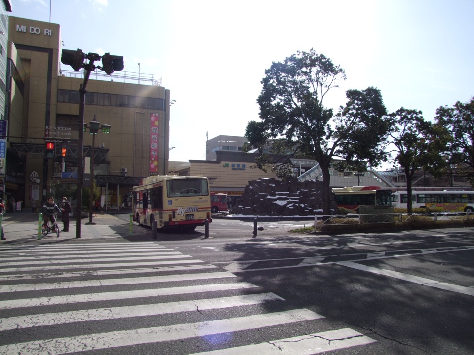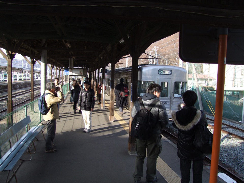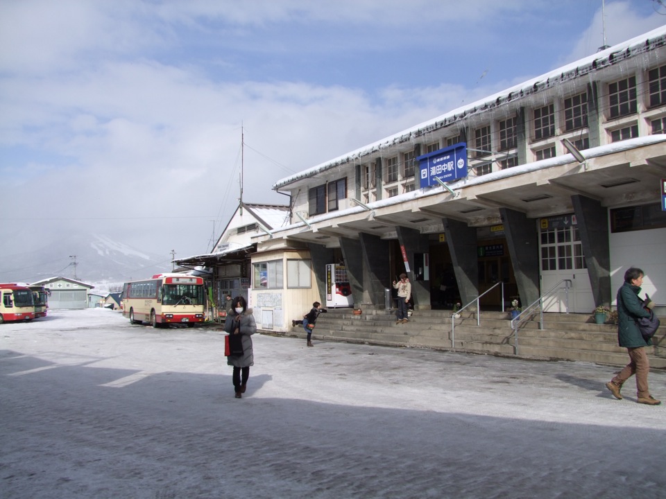 さて、終点湯田中駅に着きました。辺りはもう普通に雪景色の中という状態です。駅前の道は凍結していますし、これは注意しないと転んでしまいそうです。志賀高原へのアクセスは、ここから更にバスというのは昔から変わっていなく、この日も休日という事もあって、何人かのお客さんは各方面へと散らばっていくのが見えました。この駅は、自分は今回が初到達です。