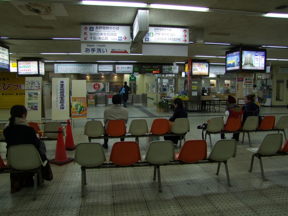 車ですと、高速道路を使っても3時間以上は見ておきたい東京~長野間ですが、ここは流石の新幹線という感じで、今回乗った大宮駅~長野駅間は、約1時間20分という行程でした。時刻的には、長野駅に11:00過ぎには着けたわけで、まだまだ集合時刻には余裕がある時間帯です。少々残雪もあった長野の中心へと降り立ち、冷たい空気で背筋がピンとなってしまう中、早速、長野電鉄の起点となる長野駅(JRのと異なり、地下にあります)へと移動を開始しました。