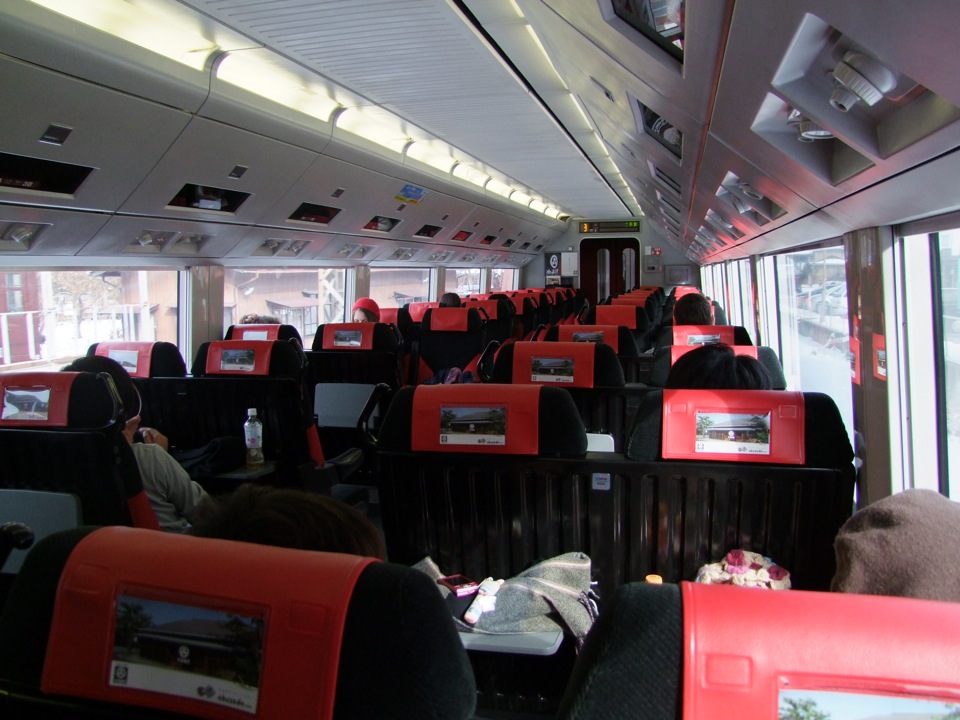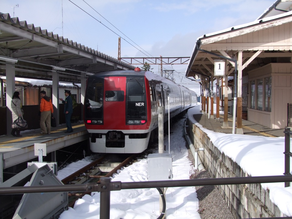 途中の信州中野駅までは、長野盆地の盆地部分をひたすら走る…といった感じでしたが、この駅を過ぎると、終点湯田中駅まで向かって、俄かにキつい上り勾配の連続となります。湯田中は志賀高原の入口ともなる駅なので当然とも言えますが、雪深くもなってきて、旅情をそそる光景にもなってきますね。そんな光景を元成田エクスプレスの車両から眺める事になるとは夢にも思いませんでしたが(笑)、長野電鉄に渡ってきて大きな改造を受ける事無く、車内も含め、見た目的には現役時代のままで楽しめるというのは、嬉しい事ですよね。アルファベットのロゴも、成田エクスプレス時代の“NEX”から、長野電気鉄道の略だと思われる“NER”に若干変わっているというのも面白いですし…(笑)。