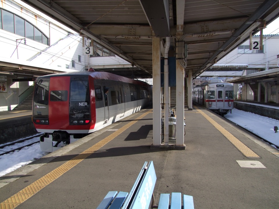 左上写真をご覧下さい。現在の長野電鉄の長野駅ですが、元東急と元JR東日本車両の見事な共演ではないですか(笑)。譲渡前の状態では絶対に見る事が出来なかった光景でもあります。まずは普通列車として走っている元東急の車両に乗り込み、ある程度距離を稼いでから、後から走ってきた特急“成田エクスプレス”号…いや、こちらでは“スノーモンキー“号へと乗り換えて、まずは長野線の終点、湯田中駅まで足を運ばせました。その間には、元小田急の特急車両(こちらでは“ゆけむり”号として運転)とも擦れ違い(左下写真参照)、こちらでも元気に働いている事が確認出来たのが良かったです。