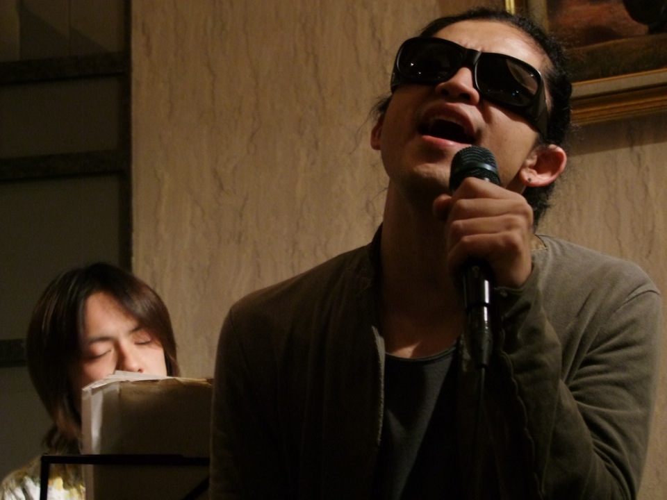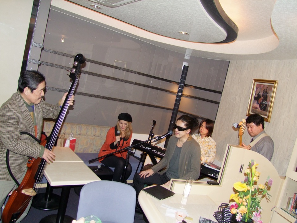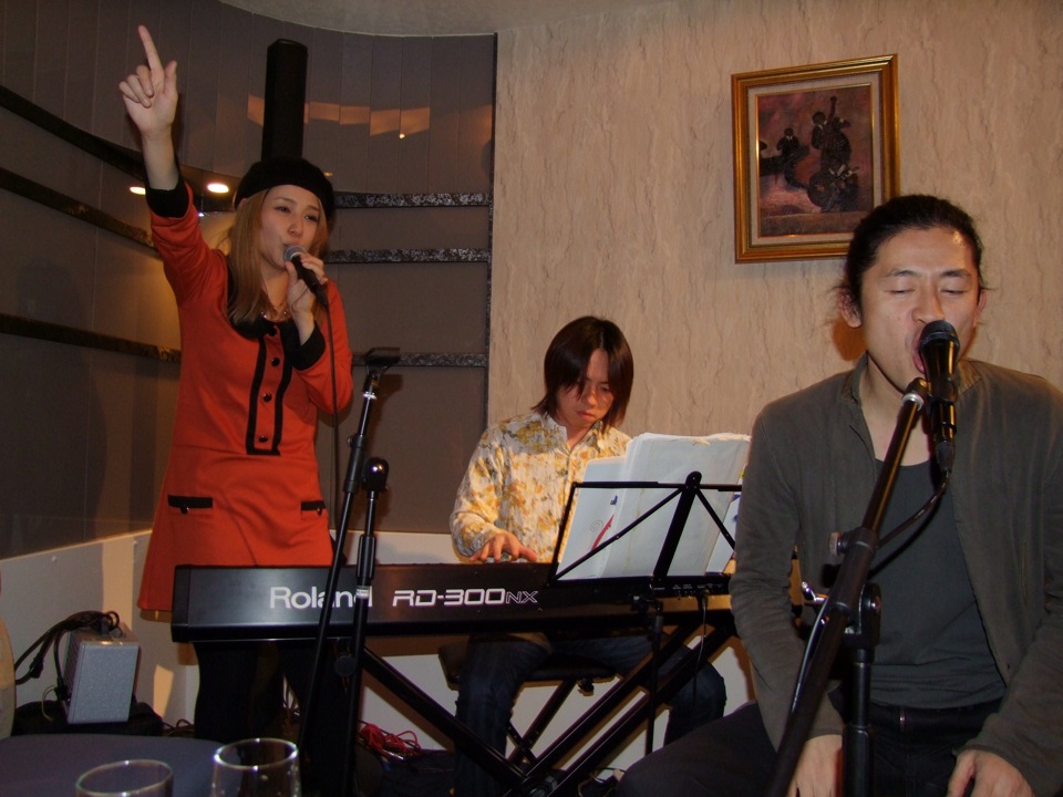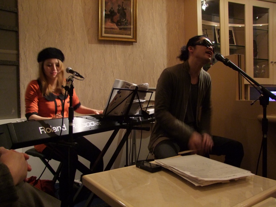 今回は、キーボード&コーラスの杉山由香里さんという方が遊びに来てくれていたので、早速自分の席を交代し、ナオキさんと杉山さんのデュオ編成を、外部から見る…という状況にもしてみたりしたものです(右上写真参照)。この事からも、想像以上に和やかな時間が流れているのだと、お分かり頂けるのではないかと思います(笑)。