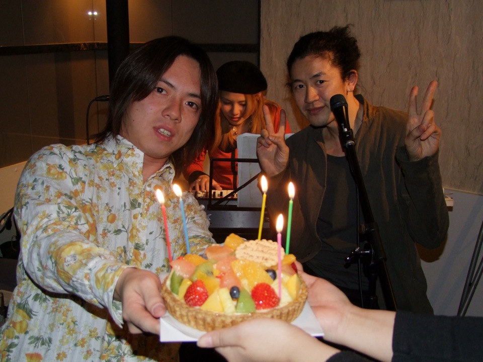しかし、自分が驚いたのはこの後でした。暫くこの2人で演奏していくのかと思いきや、よく聴くとそれは“Happy Birthday”…。ナオキさんも、そのバックに合わせて歌っていき、そのまま「Dear Daisuke~♪」と言うではないですか。そして、その瞬間にお店からバースデー・ケーキまで手渡され、お店やお客さん方から、プレゼントまで何点か頂いてしまい…。要はこの為に、準備万端で進められていたのです。