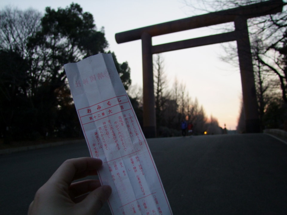 そして初詣と言えば、おみくじも忘れてはいけません。ただ、靖国神社のおみくじは凶が設定されてないようで、末吉、吉、小吉、中吉、大吉の5段階でした。少し張り合いが無い感じがしてしまいますが(笑)、2012年初めてのおみくじ…。さて、結果は、、、