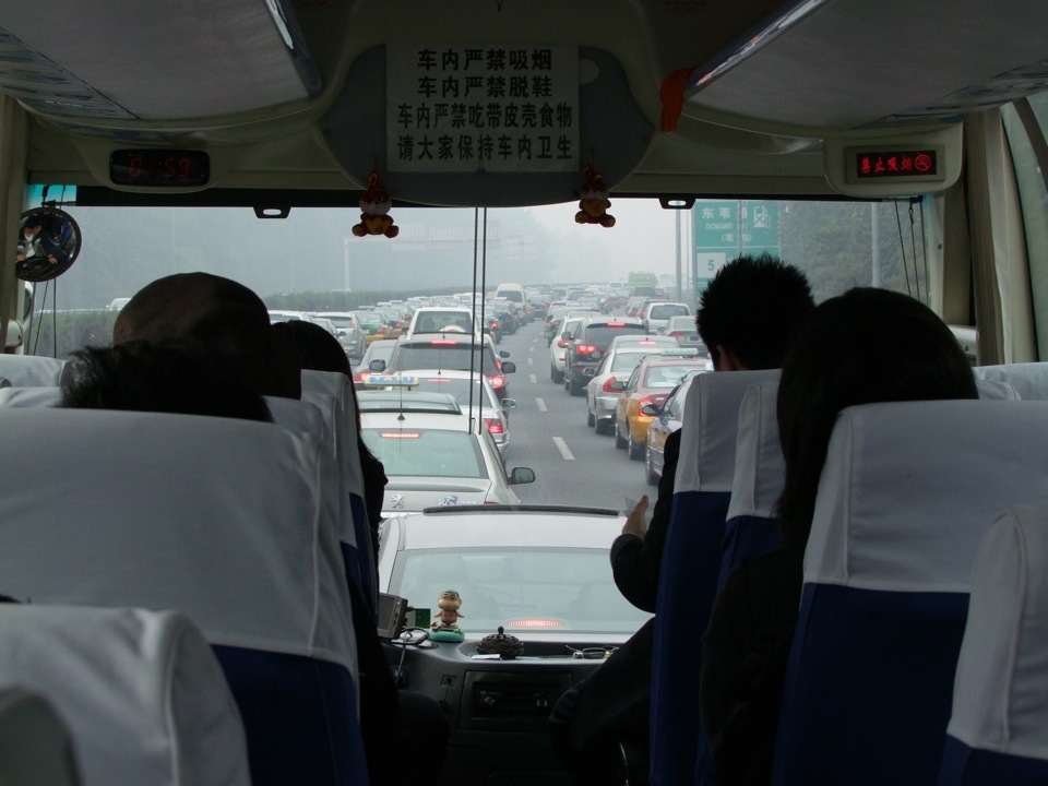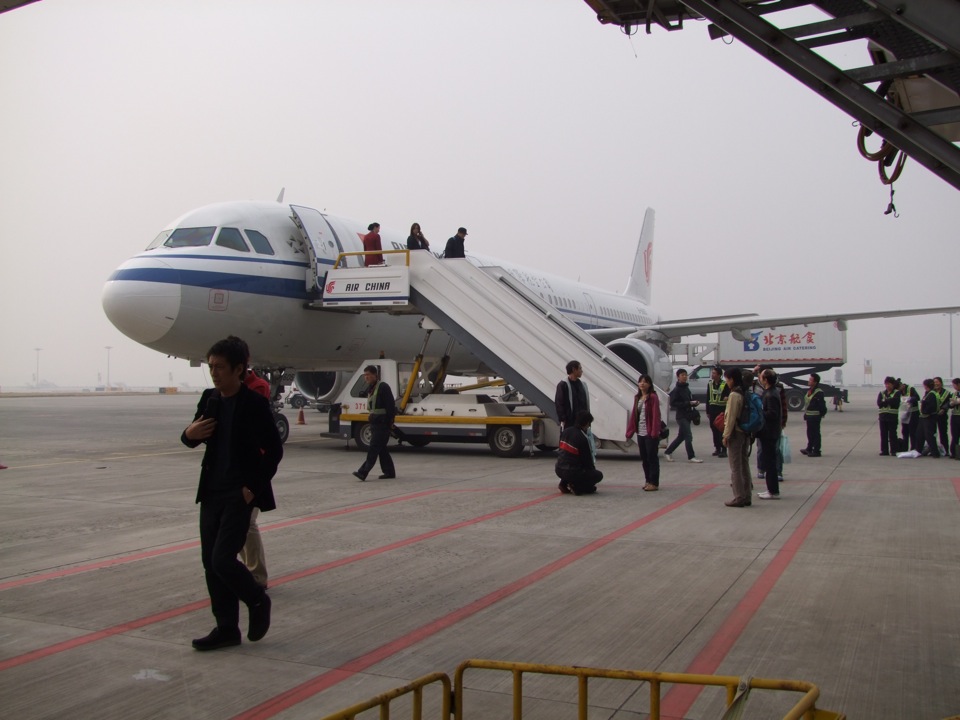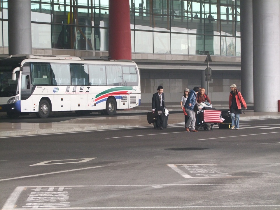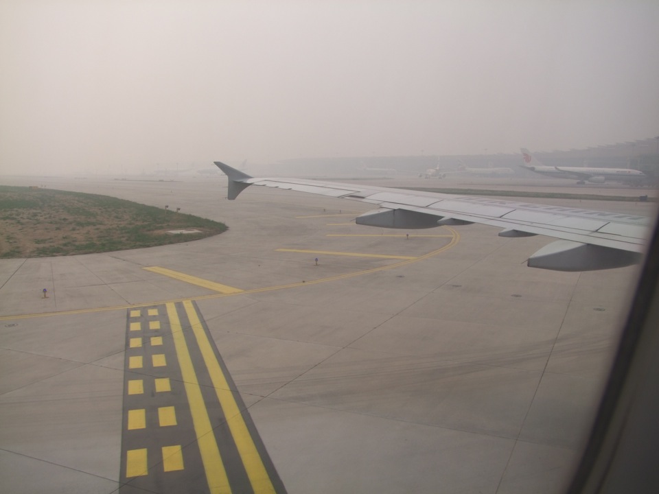 着陸の直前になって、ようやく地面が見えてきたと思ったのも束の間、そのまま飛行機は北京首都国際空港に到着しました。周囲は右上写真のように茶色くガスっていて、これぞ中国っぽい風景…とも思ってしまいますが、出来れば晴れの景色も見たいものです。広大な空港では、それこそ移動には時間が掛かり、飛行機が到着して降機し、入国手続きや荷物受取やら色々あって、市内に向かうバスに乗れたのは、到着1時間後という感じでした。まあ、これは前回で既に予測済みの事でもありますが…(笑)。