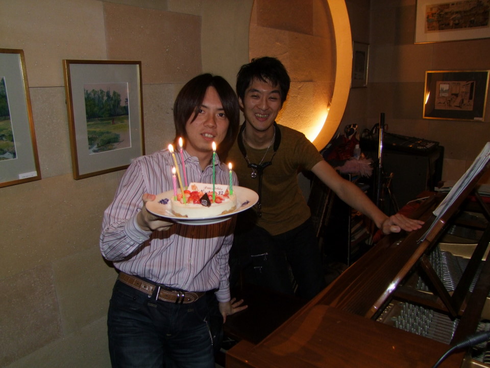 振り返ってみると、自分達のオリジナル曲(新曲も)あり、カバー曲あり、スタンダード曲もあり、そして自分の為にバースデーの曲を郷原君がサプライズで(若干やりそうな気配が漂ってましたけど…笑)ピアノで弾いてくれたりする瞬間までありと、本当にバラエティに富んだ音楽で溢れた1日だったと思います…。バースデー・ケーキも戴きつつ、アットホームで温かった、そんな印象のライブになりました。どうも皆さんありがとうございました!