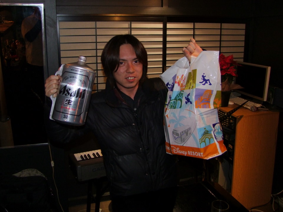 極めつけは、3リットルの缶?ビール(笑)!…なかなか持ち帰るのは大変でしたが、自分のビール好きというイメージ(まあ、事実ですが…)を改めて不動のものとさせた逸品でもありました(笑)。この写真の時点で、更にブランデーやらシャンパンやらを飲んでしまっている状態なので、何となくヘラヘラした感じではありますが、日にちをまたいで2月1日になった時間でもあったので、恐らく今年最後の誕生日祝いの日だろうと、感慨深く思っていた状態でもあったような気がします(笑)。