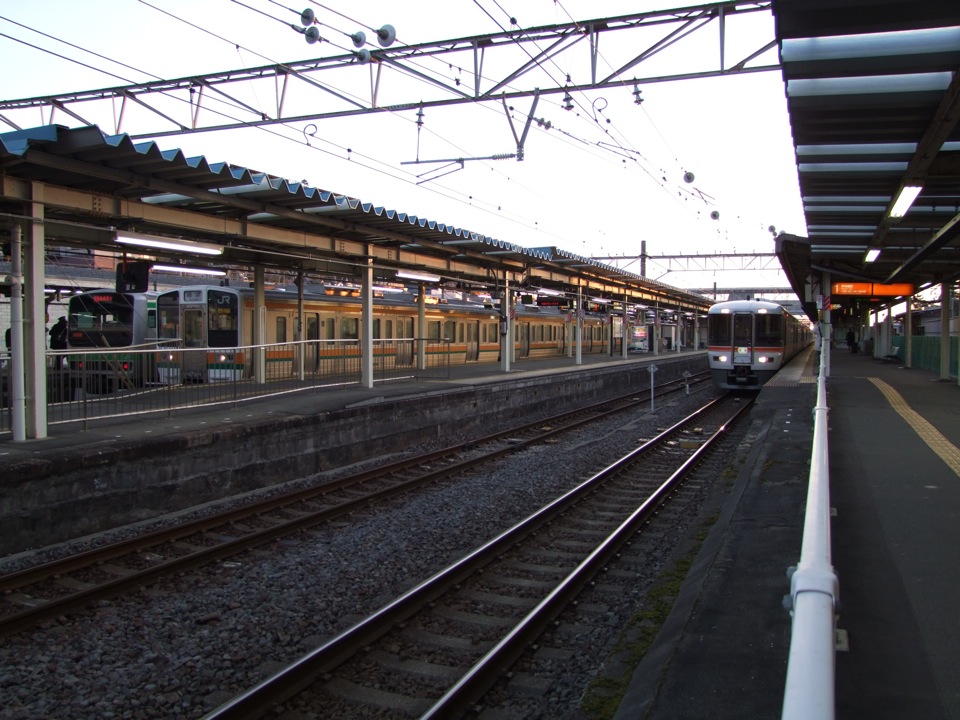 御殿場線の“さんぽ”は国府津駅から始まります。朝の国府津駅は、これから東京に通勤していく乗客で賑わいを迎えつつありますが、御殿場線のホームでは、それとはまた違った雰囲気を醸し出しています。これから東京に向かっていく列車は、殆どが15両編成なのに対し、これから乗る御殿場線の列車は3両編成だったので仕方ないですが(笑)、路線の性格が違い過ぎるという事でしょうか…。ここは、JR東海の在来線では一番東端に位置する駅でもあり、JR東日本地域の中では、やはり異色の存在の路線なのです。せっかくなので、現在1往復だけ東海道本線東京口に乗り入れる、JR東海の373系車両との写真(右下)を載せておきましょう。