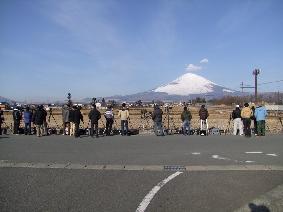 見よ、このカメラマンの数!…背後に綺麗に富士山が見えるのが分かると思いますが、実はここは、御殿場線の、超が着く程の有名な鉄道撮影地でもあるのです。それは、列車が入った写真を見れば一目瞭然化と思いますが、正に絵に描いたように、鉄道と富士山が素晴らしいバランスで写真に納まってくれるのです。