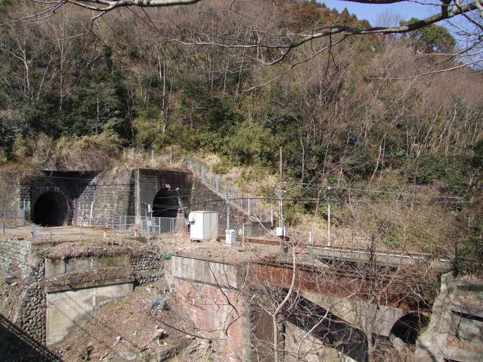 山北駅の西側区間は、路線が桜並木に覆われた有名区間ですが、今の時期は流石にまだ早い感じですね。桜の時期は、それはもう見事な光景が目に飛び込んできます。そのまま進み、山北の街並みを過ぎると、いよいよトンネルに入ります。ここからは暫くトンネル区間が続きますが、こちらは単線であるのに、横にもう1つトンネルの跡があるのが分かります(右上写真参照)。また、橋脚の跡や、そもそも通常?の単線区間にも、不自然に横に線路跡らしきものが続く等、これこそかつての東海道本線時代の複線路線の名残なのです。ただの線路跡は、もう痕跡が土地が空いている…ぐらいしか確認出来ないので難しいですが、トンネルや橋脚の跡は、意外にもそのままで残っている所もありますので、走っている列車の中からでも確認できてしまいます。
