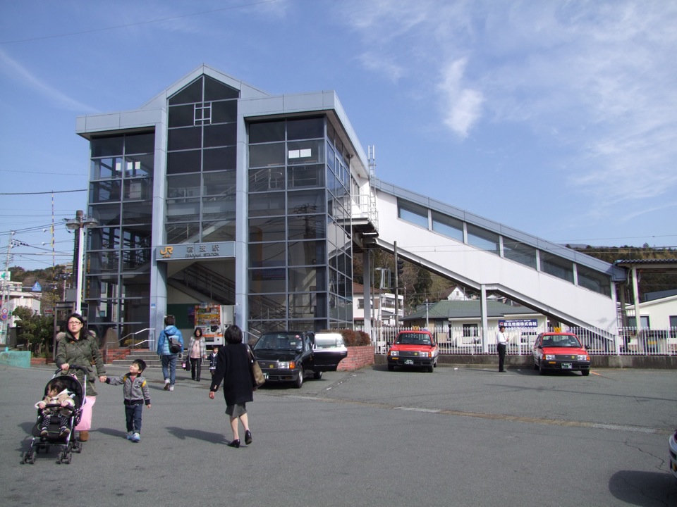 そんな区間を、自分は歩いて回ってみましたが、道路は線路ほど真っ直ぐにはなっていなく、やや回り道をしてのルートとなっています。車通りは結構あるのですが、歩いている人は皆無と言っても良いでしょう。ちなみに、この付近の山肌を見てみると、立派な橋脚からなる東名高速道路を見る事が出来ます。こちらは、ちょうど上り線と下り線が別々のルートを通っている区間でもあり、山から山へ、遥か高い所を一気に渡ってしまう等、想像以上にダイナミックに建設されているので、御殿場線沿線の喉かな雰囲気を一瞬で消し去ってしまうような迫力があります。日中は、2両編成のワンマン列車が約1時間毎にしか走っていない区間ですが、道路的には東京と関西方面を結ぶ、重要な大動脈の一区間である事が窺えるというものですね。次の駅になる谷峨駅も、背後には立派な赤い橋脚の東名高速道路が望めますが、駅自体は無人駅で、恐らく利用客も少ないでしょうね…。