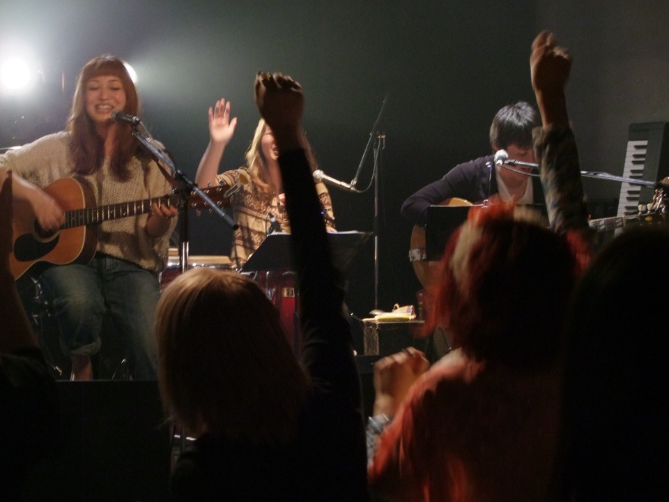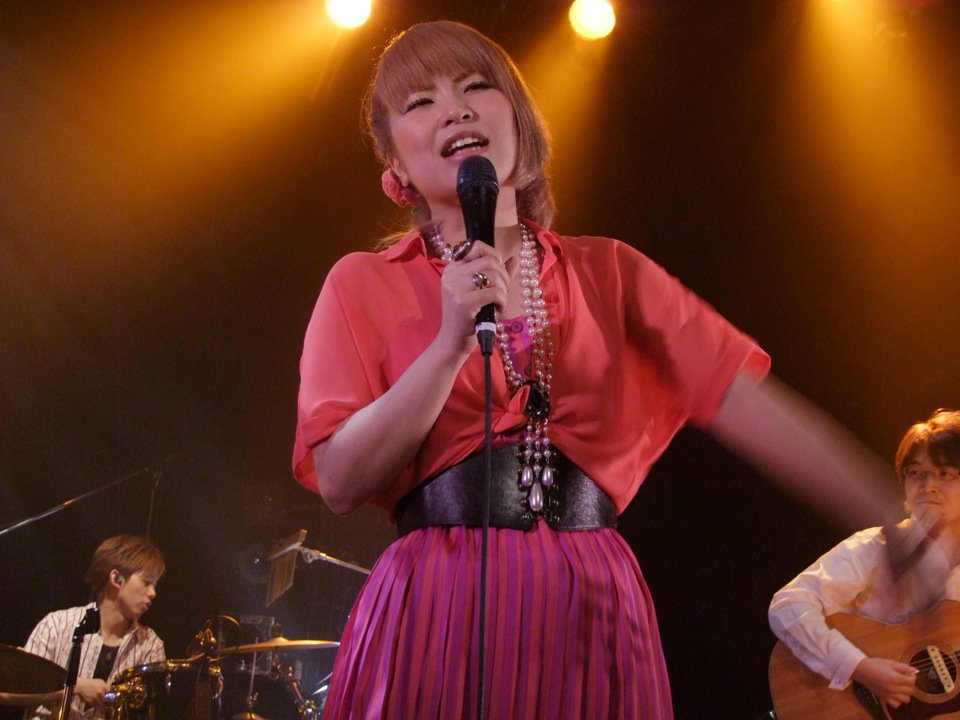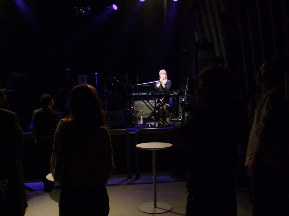 やはり違いは、ベースとパーカッションが入った事でしょう…。ここが生み出すリズムが土田さんの歌声に絡み、心地良い時間を作り出してくれているのです。カントリー調な側面もあるのかもしれませんが、更にノリの良い曲もあり、彬子さんもここぞとばかり客席の前に陣取って、一緒に盛り上がっている感じでした(右上写真参照…笑)。そんな客席との一体感も素敵だったと思います。