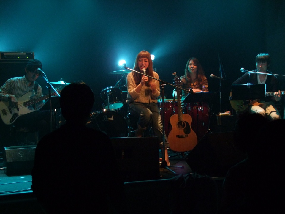さて、今回のイベントの出演者は自分達も含めて4組…+1人…。この“+1人”と言うのは、1月のライブで初披露させて頂いた、彬子さんの弾き語りステージ、オープニングアキコ…の事です(本人は、このネーミングを流行らせたいそうです…笑)。挨拶…兼トーク、兼演奏…という感じで進められていくこのステージ?は、ある意味で一番彬子さんらしい時間でもあり、このイベントの雰囲気を端的に表している時間だとも思います。御存知の通り、非常に緩い時間でもあるのですが(笑)、それでも弾き語りで2曲…、気力で弾き切ってしまう姿は流石です。客席との絡みも多く、皆で笑顔で見守っていた時間でもありました(笑)。