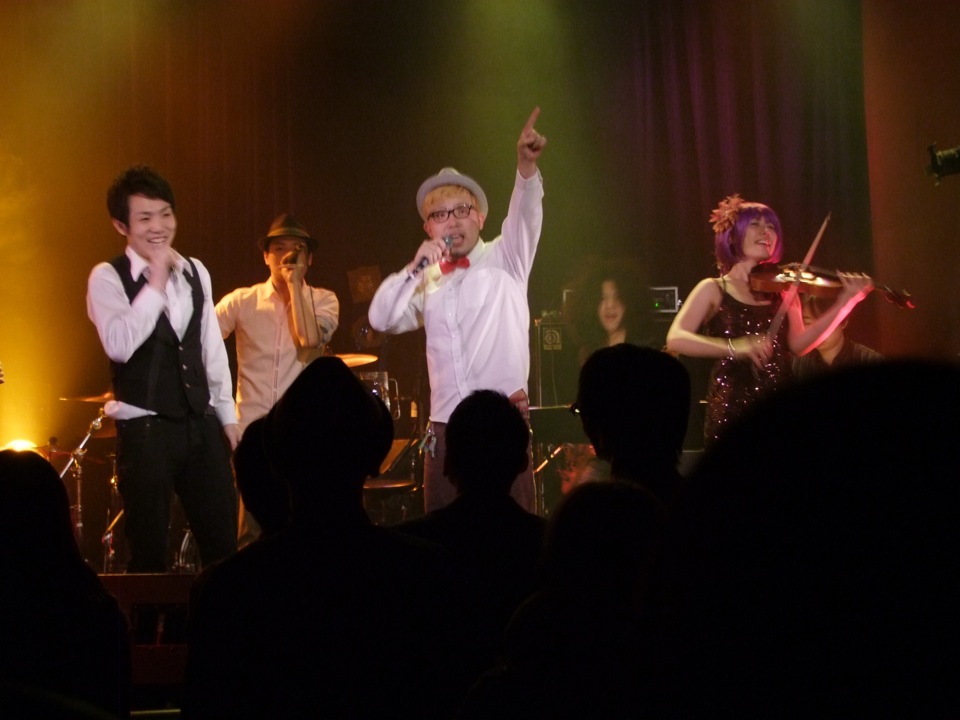 3バンド目は、ボーカルの MASAHIRO さん。これは所謂、“格好良いバンド”…です。随所に凝った工夫が見られ、見るものを楽しませてくれる要素が十分に感じられました。MASAHIRO さんのステージングも素晴らしいのですが、サイドを固める演奏陣も1人1人が本当に個性的でして、特にバイオリンとボイス・パーカッションは重要な位置を占めていました。これぞ豪華と言えるステージで、演奏時間もあっという間という感じでした。客席が温まるのも当然で、最後の自分達の出番に際して、これ以上無い状況で引き渡してくれました。後は、自分達の全ての力を出し切るのみです!