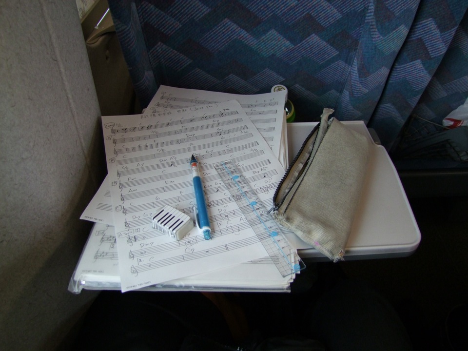 自分はよく、東海道新幹線は品川駅から乗るのですが、ここから“のぞみ”号で、名古屋駅までは約1時間半という行程になります。いつもなら景色を見たり、車内の雰囲気を楽しんだりと、大忙しなのですが(笑)、今回は名古屋駅に着くまでにやる事がありました。右上写真を見ても分かるように、この日の為の譜面書きで、まあ、本来この作業をやる筈だった前日の夜に自分が寝落ちしてしまったのが悪いのですが(笑)、とにかく、この場で完成させなければなりませんでした。しかし、全速力で走っている新幹線の車内での譜面書きは大変で、混んでいたという状況も拍車を掛けていたのかもしれませんが、小さいテーブルの上では作業が捗らず、おまけに列車の揺れからか酔ってしまい、小田原駅を過ぎた辺りでいったん中断…。そして時間を空けて、また書き始める…という状況を繰り返しておりました。