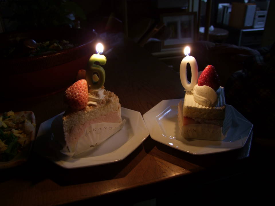 そんなわけで、誕生日ケーキもささやかな感じです…(笑)。ちなみに、母親も同じく60歳になっていますので、2つのケーキに数字ロウソクを1本ずつ立てるという策に出てみました。喜んで貰えたのでしょうか…。