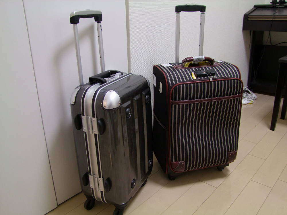 手前の物が新しく購入したもので、奥が今まで使っていた物ですが、若干スリムになった感じがお分かりでしょうか…。しかし、このスリムになったという部分がで重要で、飛行機に乗る時での機内持ち込みが出来るか出来ないかの、ギリギリな境目だったりするのです。今までのも、機内持ち込みに出来なくはなかったのですが、大量に荷物を入れてしまうとスーツケース自体が膨らみ、基準値をオーバーしてしまっていた事が何度かありました。…という事でハードケースならその心配も必要ありません。心置きなく、機内に持ち運びたいと思います(笑)。