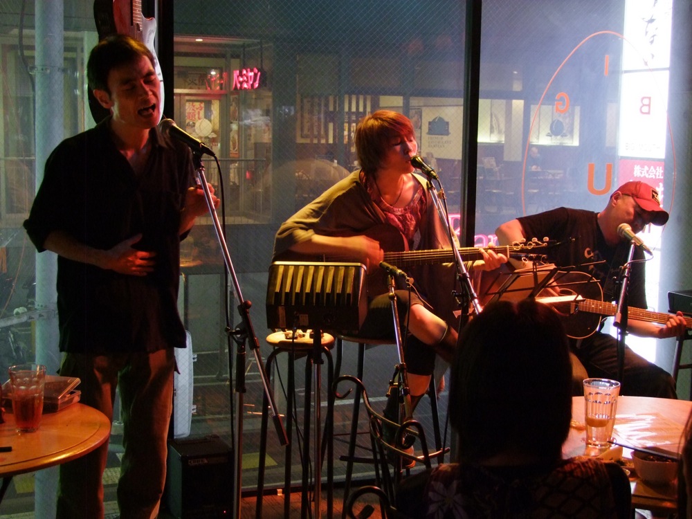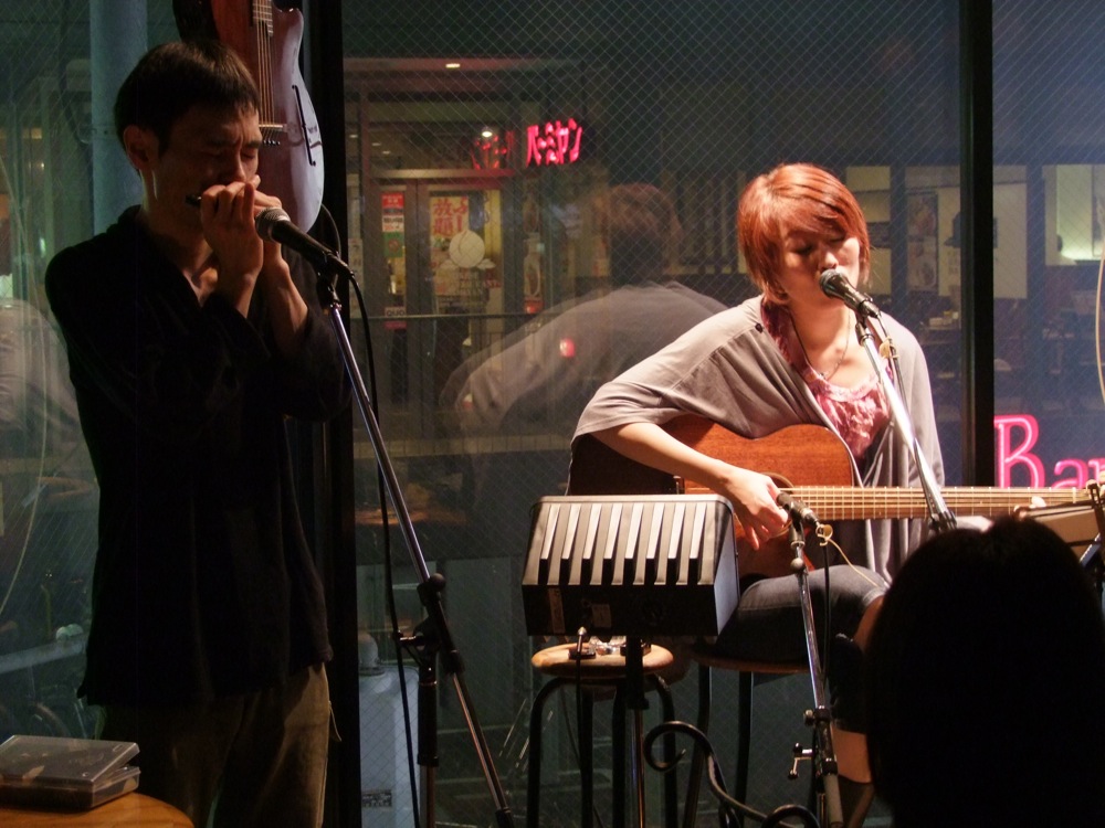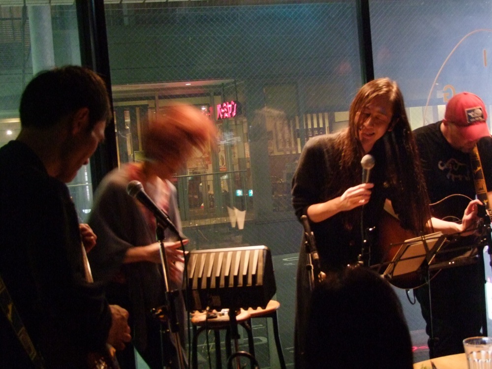 そして、途中に“遠くでひばりもないている”という曲を演奏しましたが、これは以前に自分達と対バンさせて貰った、とんちピクルスさんの曲〔とんちピクルス×鹿嶋敏行、ライブ参照〕でもありました。この曲では、3番目に出演の WOODY の、てけしさんにブルースハープで(半ば強引に)入って頂き、3人で演奏しましたが、元々素朴な雰囲気のある曲に、更に素朴感と哀愁感がプラスされたようで、気持ちの良い時間が流れていきました。