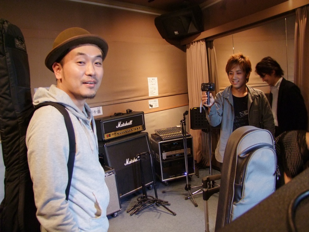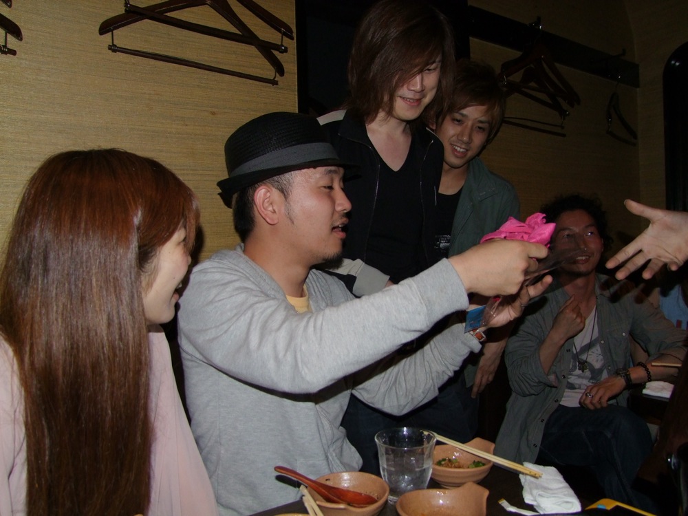 …その時、誕生日ケーキを持って、自分達とも親交が深く、卓さんもベースを手伝っている、ボーカルの EYE(清水愛)さんが登場!…一気に誕生日会らしい雰囲気になってきて、早速皆でつつきます。しかし、まだ卓さんは、これから本当はリハーサルがあるのではないか…と、より疑い深くなっている感じが伝わりましたね(笑)。無理もないですが…。