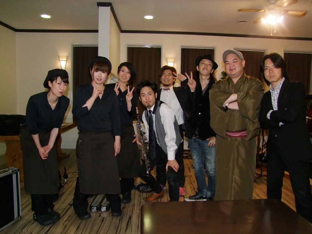 自分で言うのも何ですが、この時の寝付きは物凄く良かったです(笑)。寝て起きて、次に気付いた時には時計はもう14:30過ぎになっており、間の記憶が飛んだまま、“Cafe 楽”入りを果たしました(この時、家の隣りに位置するのが、どんなに嬉しかった事やら…笑)。お店では既に機材セッティングの準備がなされ、テーブルや椅子がいったん片付けられ、徐々にステージらしき雰囲気が出来上がってきています。そもそも、このお店でライブ…というものが行われる事自体が初めての事で、自分達は勿論、店員さんも慣れない状況にドタバタな感じではありますが、なんとかステージが出来上がり、リハーサル中には客席も出来上がり、いよいよ本番を待つのみとなりました。