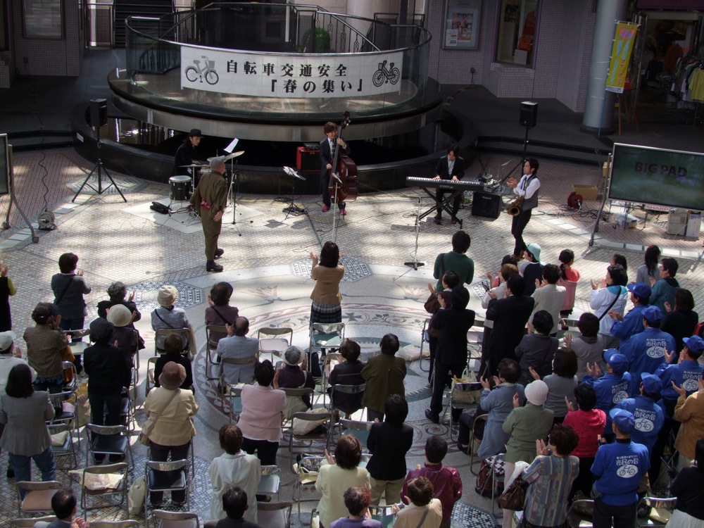 今回この場所では、堺警察署による自転車交通安全「春の集い」というイベントに、TRI4TH がゲストとして出演する…という事になっています。イベントは13:00から始まり、会場の広場には椅子を敷き詰め、安全指導等を行っていき、途中では“ザ・セーフティー・サイクルマン”という謎のキャラクターも登場(かなりガタイが良い…笑)したりして、なかなか皆さん楽しんでおられる様子です(笑)。そして、意を決して?自分達の登場。『わらべ JAZZ』を中心に、野外という環境を生かして、伸び伸びと演奏させて頂きました!