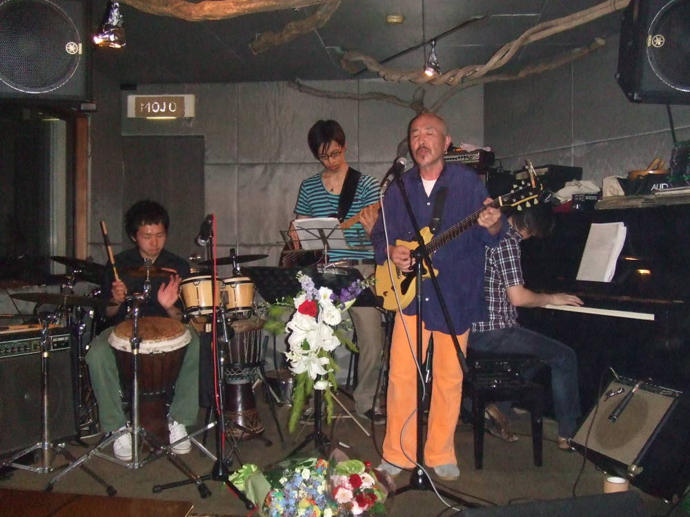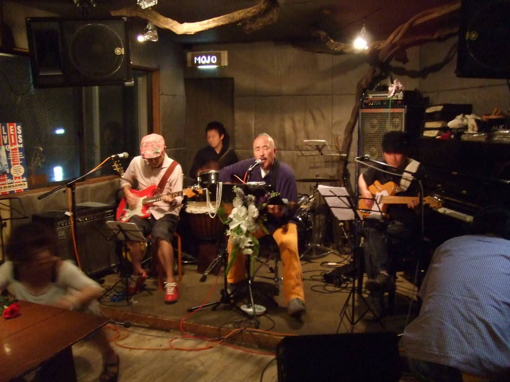 この日のライブは、2部構成となっていました。1部は、伊藤さんの息子のミキヤがドラムを担当する、題して“入間川少年団”と名付けられた4人編成で、ギター・コーラスにドッグス小高さん、ギター・ハープにならじんさんを横に置き、こちらも伊藤さんは出演してました。そしてミキヤがジャンベに変わり、入れ替わって自分と池田君との4人編成になったのが、いつもの自分達のスタイルである“さばいばるいとう UNIT”です。ライブをするのは久し振りで、実際に今年初ですから当然ですが、この所沢の Mojo という場所も新鮮さに拍車を掛けていたのでしょう。じわじわと昔の感覚を思い出してきた感じでした。