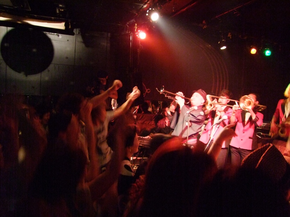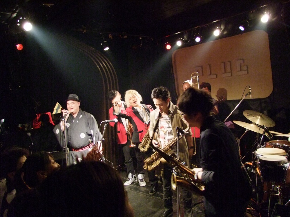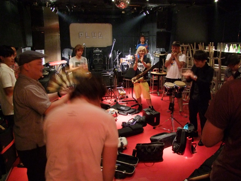 そして本編が終わり、そのままアンコールへと突入です。曲はお馴染みの“Hammer Head”でしたが、ここで ETHNIC MINORITY の横田寛之君、そしてカルメラのホーン隊の皆さんにも加わって頂きましょう。ステージ上には計10人がいた事になりましたが(笑)、このイベントの締め括りに相応しい光景でもありました。もう皆、弾きまくり、喋りまくり?で、この日一番の盛り上がりを見せていたと思います。そして、よく見ると、カルメラのリズム隊のメンバーも客席の前の方に出てきてて、一緒になって盛り上がっているではありませんか!…これこそが正に一体感。素晴らしい時間でした。