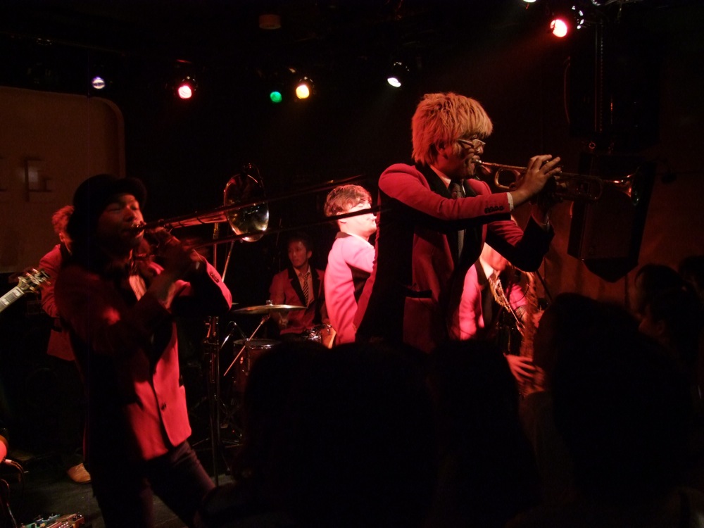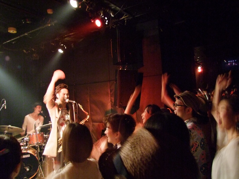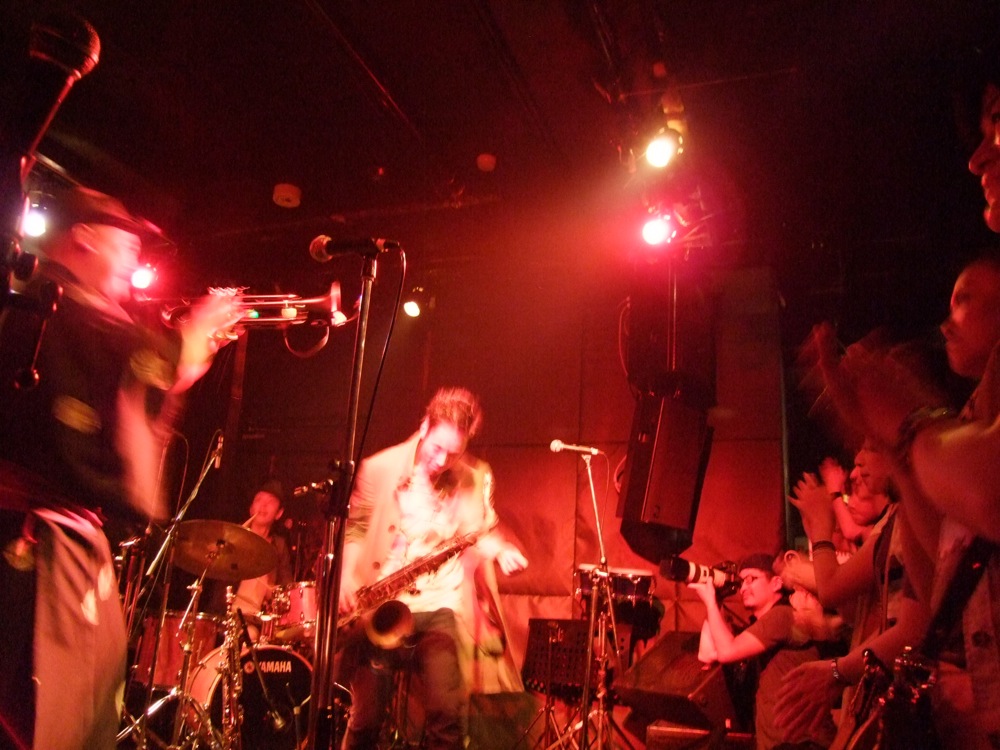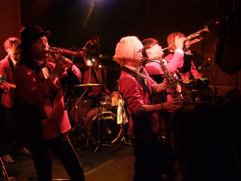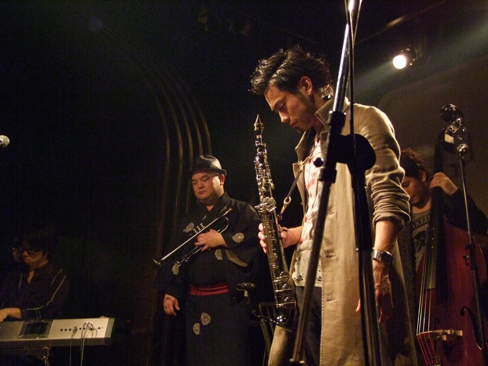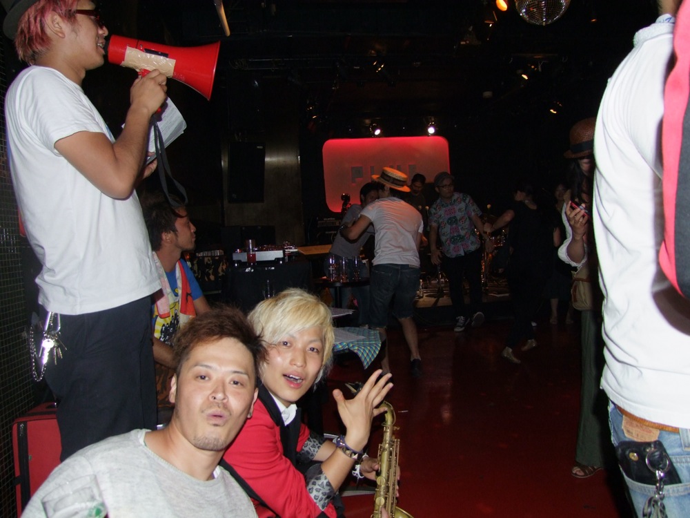 お店での本番前の流れというのは、通常“逆リハ”と言って、本番のバンド順を逆にして、会場でリハーサルが行われるのですが、この時から既に自分達は楽しかったのです。…と言うのは、ETHNIC MINORITY もカルメラも、どちらも自分達が本当に好きなバンドで(だからこそ今回のイベントに呼んでいるわけですが…笑)、リハーサルとは言え、音を出している時点で既に格好良く思ってしまい、一気にテンションが上がってしまいます。それはサックスの藤田君も、本番前にビールを注文してしまうというものです(笑)。