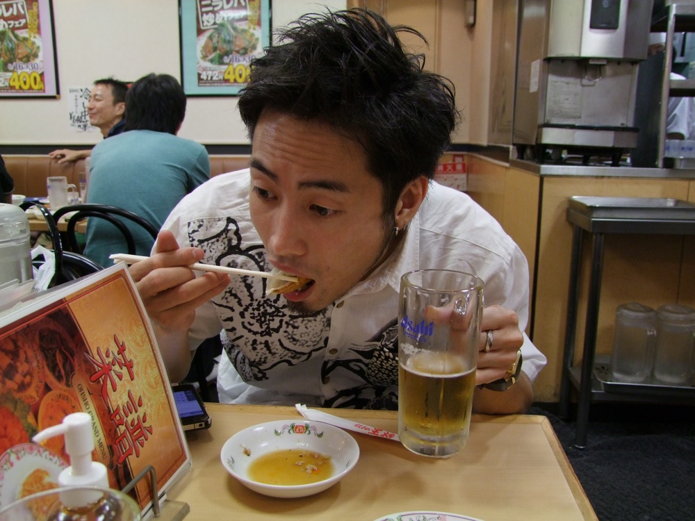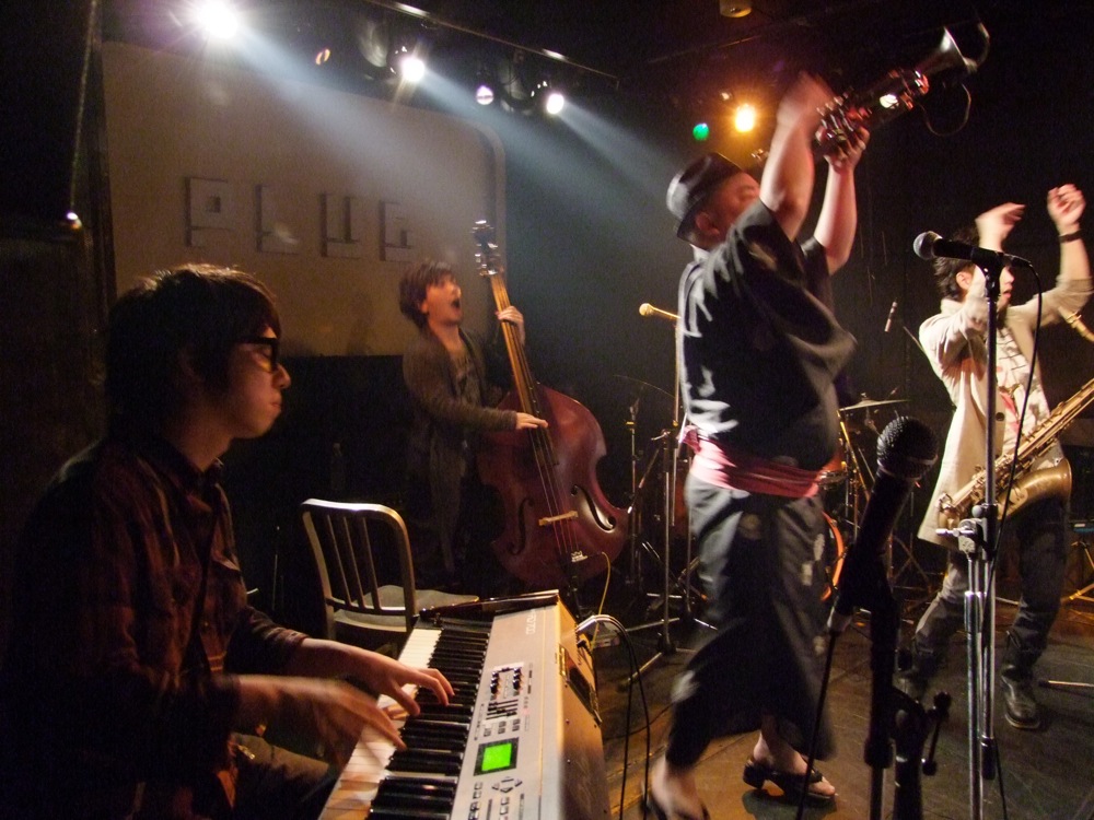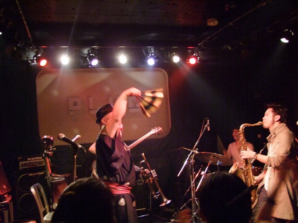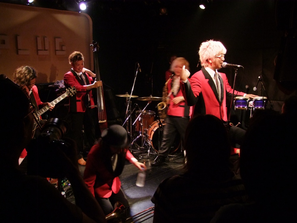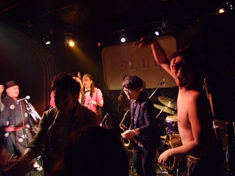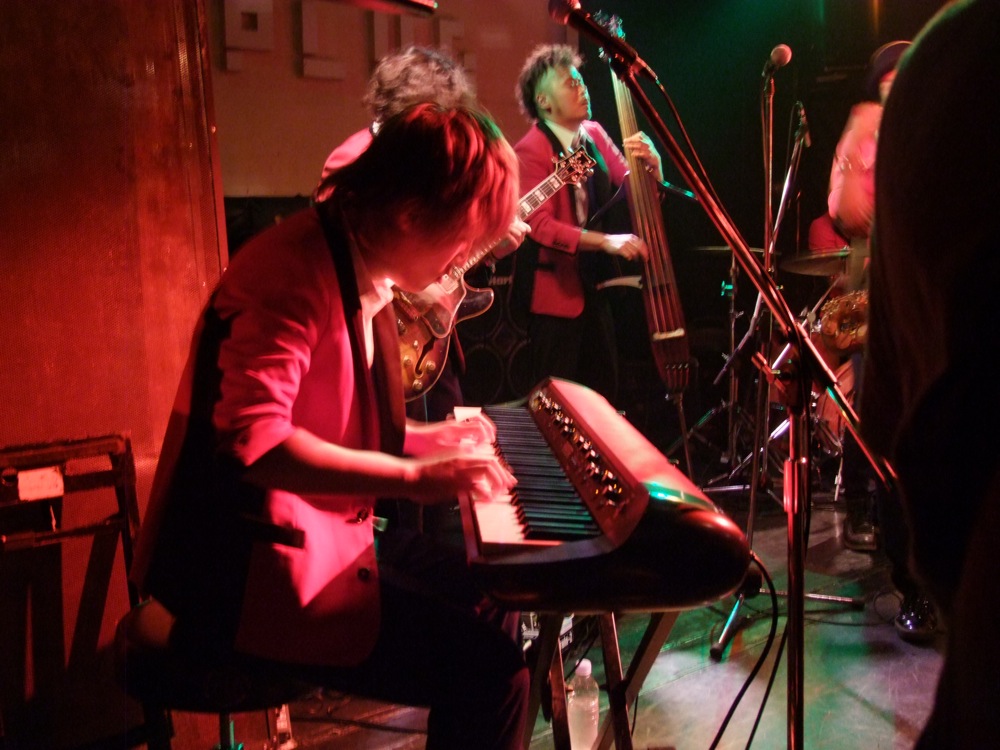 お店での本番前の流れというのは、通常“逆リハ”と言って、本番のバンド順を逆にして、会場でリハーサルが行われるのですが、この時から既に自分達は楽しかったのです。…と言うのは、ETHNIC MINORITY もカルメラも、どちらも自分達が本当に好きなバンドで(だからこそ今回のイベントに呼んでいるわけですが…笑)、リハーサルとは言え、音を出している時点で既に格好良く思ってしまい、一気にテンションが上がってしまいます。それはサックスの藤田君も、本番前にビールを注文してしまうというものです(笑)。