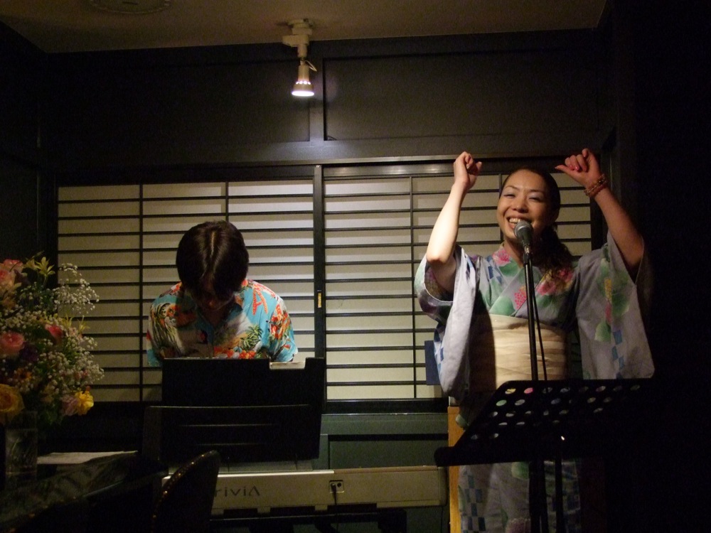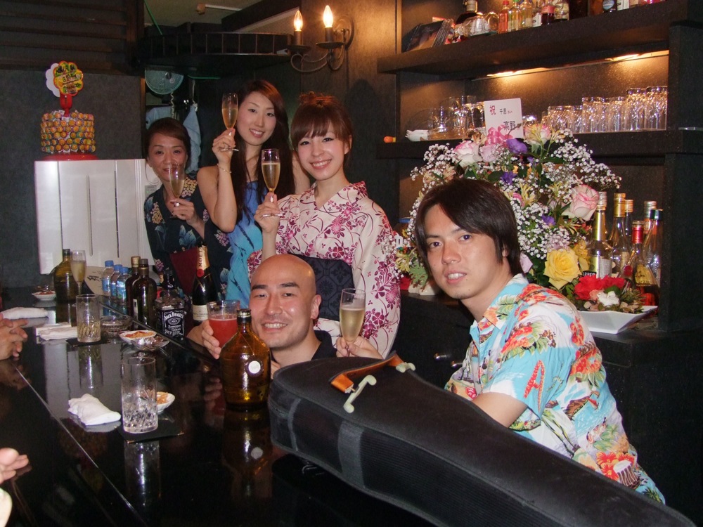 ところで、この3days期間は、女性出演者(勿論、お店のママもです)は基本的に浴衣、もしくはサマー・ドレスが義務付け?られてまして、店内も華やかな雰囲気が漂っていました。そして、自分もその空間に便乗して、久し振りのアロハシャツでの出演を決意(笑)。見た目的にも、夏を感じさせてくれる事全開のステージでしたね(笑)。ちなみにこのアロハシャツは、この3日間、全ての日に活躍をしてくれるのです。