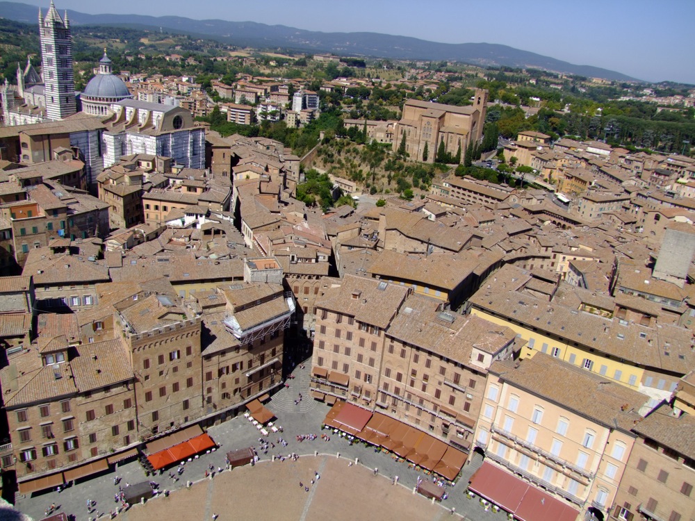 今回はフィレンツェを起点に、少し遠出をしてみました。そこは、フィレンツェから南に約50km、中世の雰囲気を留め、世界遺産にも指定されている(フィレンツェもそうですが…)シエナです。丘陵状に位置し、坂も多い街ですが、その中心に位置するカンポ広場の美しさは他には見られないものだと思います。広場に建つ鐘楼マンジャの塔から下を眺めると、広場は貝殻状のような形になっている事が分かり、薄茶を基調とした屋根や、その中で白を基調とした一際目立つドゥオモ等、要塞堅固な城郭都市として発展を遂げた事がよく分かります。