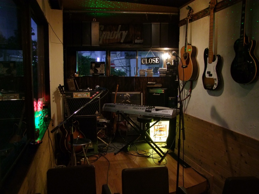 さて、まずはここ野毛という土地の独特さにも驚かされましたが(桜木町の裏とは思えない、下町っぷりで…笑)、Smoky の雰囲気もまた独特な感じでした。結構何年も営業しているような感じだったのですが、マスターに聞くと、まだ開店1年目だとか…。どこかベテラン風な空気が漂うこの場所で(笑)、自分達が演奏するというのも、何かの縁だとは思います。勿論、いつものように進めていきました。