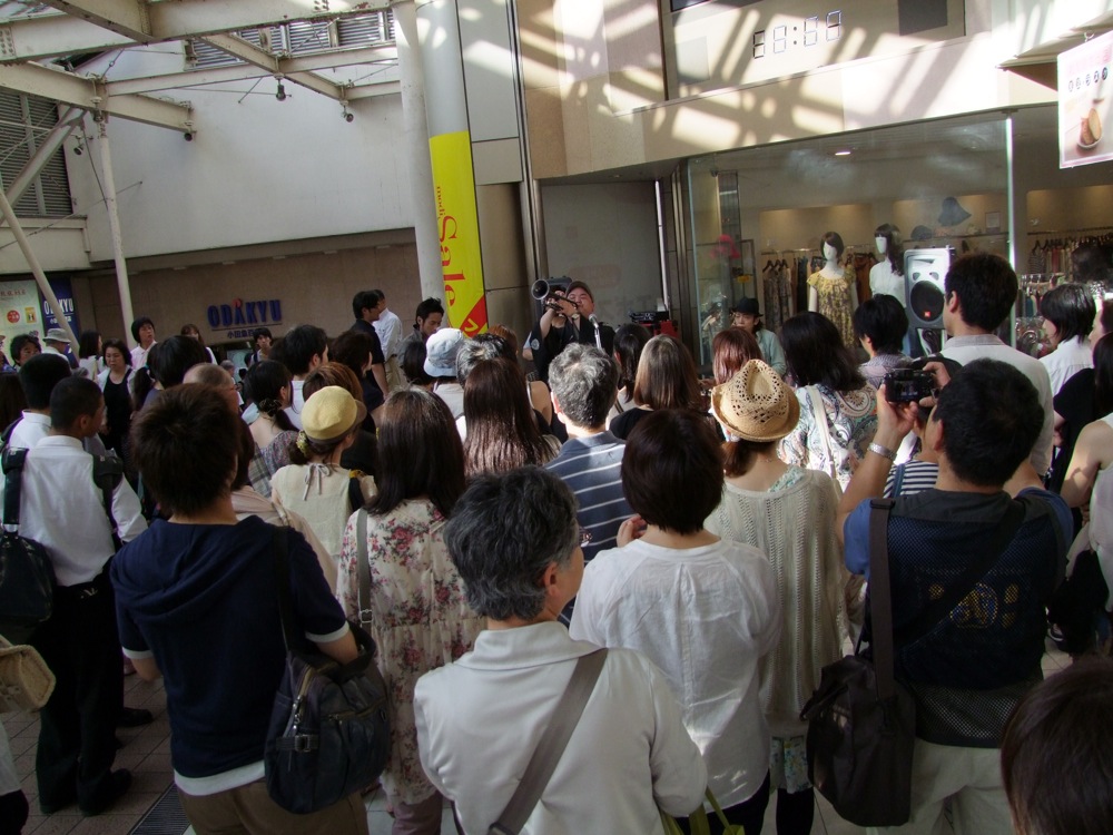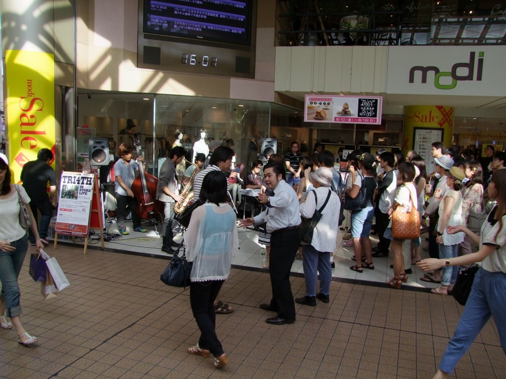 最初のステージである modi の2階エントランスでの演奏は、人通りも多い16:00頃から始まりました。2階のエントランス…というと不思議に思うかもしれませんが、ここは小田急線の町田駅と、JR横浜線の町田駅を結ぶ通路沿いに位置し、特に日曜のこの時間の人通りの多さは、正にこれでもか!…というぐらいに人で溢れ返る状況ともなっています。そこで演奏をやれるのは有難いですが、音量や場所(陣地)には結構な制限が有り、予め決めておいたセットリストをいったん白紙に戻しての考えが求められました。