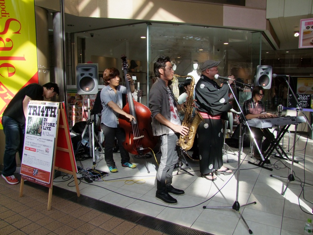 …という事で、この時に演奏した曲は“Himawari”や“New Life Standard”、そして“Circle”等に代表される、いわゆる普段のライブでは「静か目」に属する曲ばかりでした。また、外でやる時はカバー曲は必須だと思い、“幸せなら手をたたこう”や、前回も演奏した“Brazil”等も組み入れたのが、特徴的と言えば特徴的だったでしょうか…。更に言えば、これらを演奏している時も、恐らく普段の音量をセーブしての演奏となっていたでしょう…。いつもの TRI4TH ライブを見ている方からしたら、少々物足りなかったかもしれませんが、それはそれで、新鮮味のあるライブになっていた事は確かです。そもそも自分は、何かしらの制約があった方が燃えるようなタイプなのです(笑)。それがそのまま音量セーブに繋がっていたかどうかは分かりませんが(笑)、沢山のお客さんに集まって頂けたのは事実でした。これで演奏が盛り上がらないわけにもいきません…。自分の中での許容範囲になってしまいますが、何とかそれらの中で楽しくやっていけたつもりです。最後には手拍子や掛け声も飛んだりして、とても印象的ではありましたね。あっという間の時間でしたが、町田の中心部で、自分達の存在を残せて良かったように思いました。