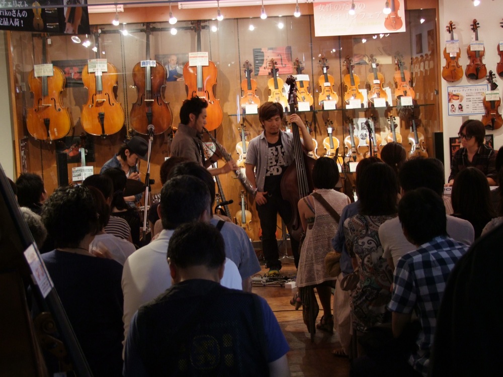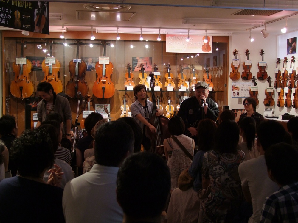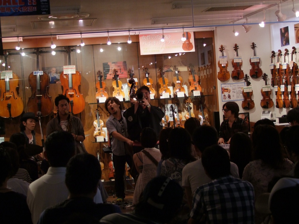 会場は、楽器店の中でも弦楽器売り場の中という、なかなか特殊な状況でしたが(笑)、実はこちらにも音量セーブのお願いはされており、セットリストも1ステージ目と似た感じにせざるを得ない感じではありました。それでも、こちらでは“Circle”を1曲目に持ってくるという(つまりは、織田君は休みです…笑)、かなり思い切った曲順に挑戦してみたりして、1ステージ目とはまた違った雰囲気で迎える事が出来たように思います。また、前回もやった、ピアノトリオ⇒フルバンド編成という流れの“Black Panther”等、各所に工夫を凝らしていきました。振り返れば1ステージ目は少々バタバタした感じもあったのですが、店内での2ステージ目は、メンバー皆それぞれが冷静になれていたとも言え、その分、“工夫”というものに余裕を持って向き合えていたようにも思うのです。自然に楽しさを見出せてきた時間でもありました。