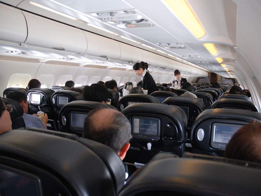 座席に座ると、やはり広いな…と感じさせてくれます…。前回の Peach に乗った時は予想以上に狭かったので(笑)、より広さを感じているのかもしれません。そして全席にタッチパネル式のディスプレイ付きや、拘りのドリンクの提供等(コーヒーとか、チョコ付きでお勧めです)、機内サービスが簡素化されている昨今では、逆に特徴的なものと見えてしまう程ですね。