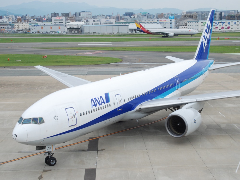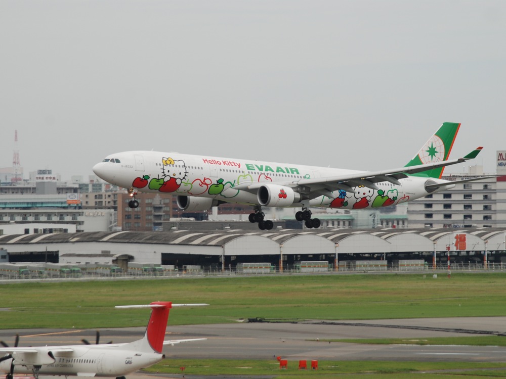それらのサービスを楽しんでいると、福岡空港へはすぐに着いてしまいました。この日は風が強めだったのか、少々揺れての着陸進入となりましたが、天候が雨ではなかったのが救いだったでしょうか。…と言うのは、この日は結構時間に余裕をもって来たので、飛行機撮影に挑もうと思っていたからです(笑)。…とは言え、スーツケースを引いての行動だったので、展望デッキから撮るだけに留まりましたが(笑)、福岡空港の展望デッキは、飛行機や滑走路が近く望めるのも魅力であり、今回も色々と収穫はありました。風は依然強くなっているようで、台北から到着したエバー航空(左下写真参照)の機体は、着陸を直前に断念し、そのままゴーアラウンドしていくという、とても迫力ある姿を見る事も出来ました。こうして自分は、元気を蓄えていくわけです(笑)。