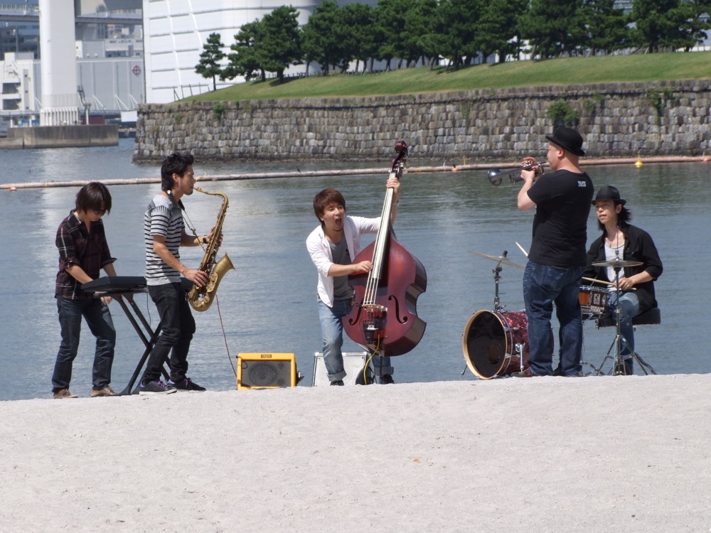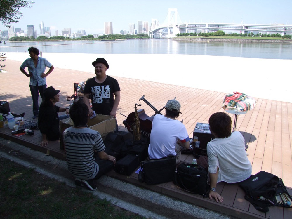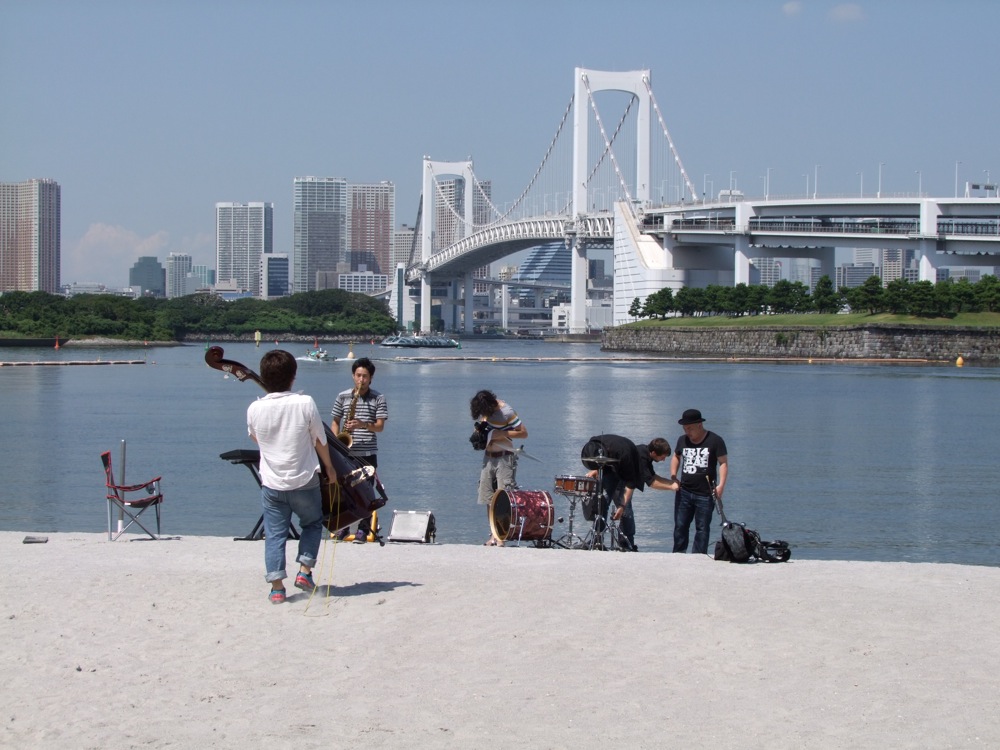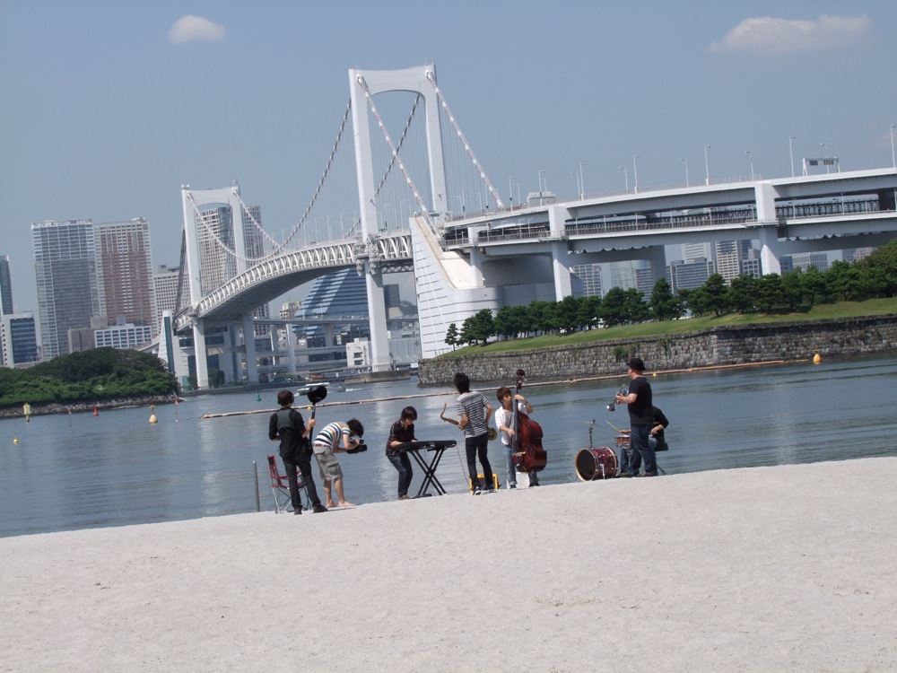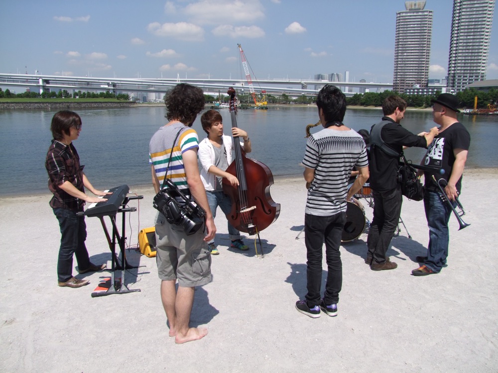 そんな撮影当日に集合したのは、写真でも分かる通り、お台場海浜公園にて…でした(笑)。この砂浜の上に強引にセットを組み、かなりの炎天下の中ではありましたが、演奏している風景を撮影していきました。