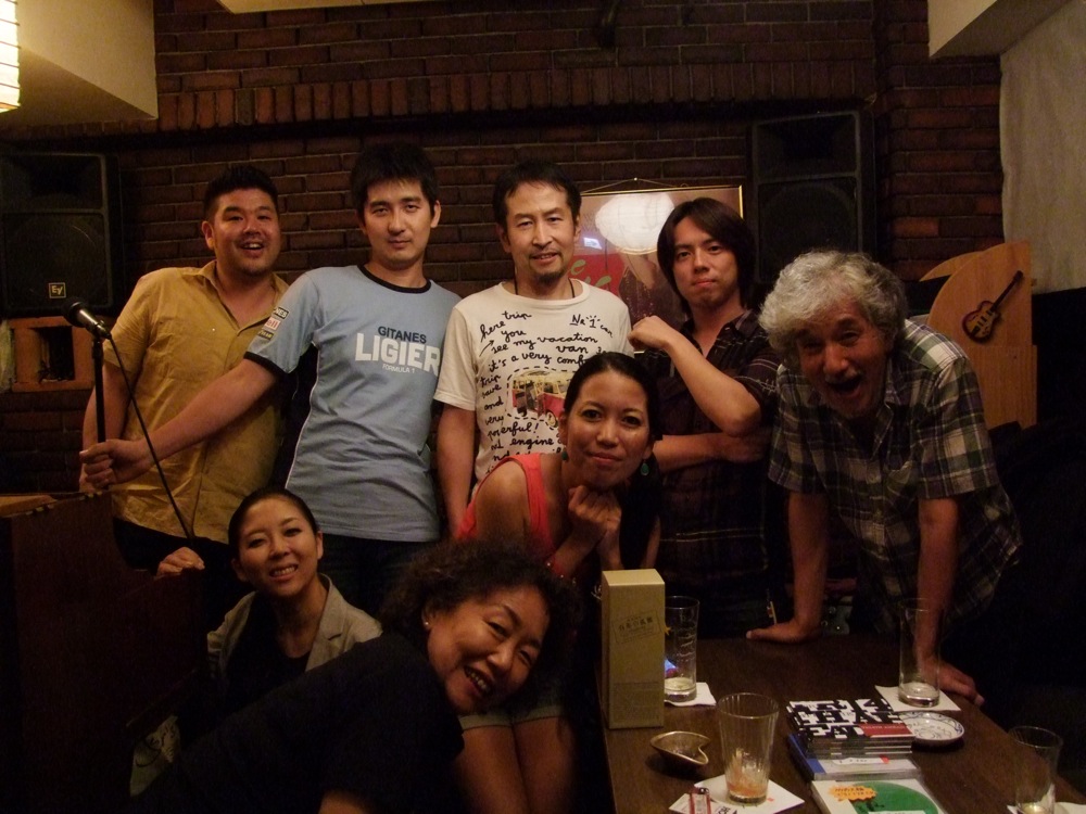 左上写真は、7日(金)に行われた高田馬場 Gate One のもので、お店の主?である、ギターの橋本信二さん、ボーカルの梶原まり子さん、そしてお馴染みの(笑)お客さん方と。右上写真は14日(金)に行われた三軒茶屋 Obsounds のもので、今回のツアー唯一の、レコーディングのメンバーが揃った日でもありました。そして、お客さんも交えて皆で、エイサーらしきものを踊ってしまっています(笑)。