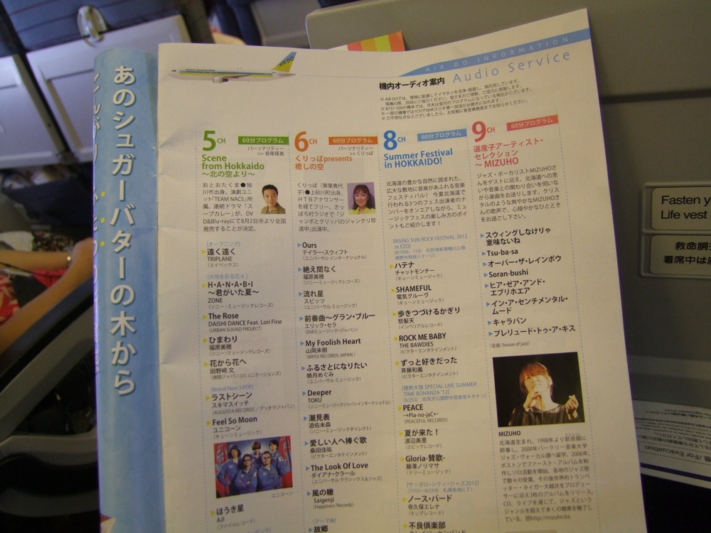 航空会社も、昨年と同様のエア・ドゥであれば、席順も昨年と同様、横3列並びです。ただ、今年の“New どさコン”の司会の方が、このエア・ドゥの機内音楽プログラムのパーソナリティを務めているという事を聞いていたので、そのチェックは忘れませんでした(笑)。普段、あまり機内音楽というのものは自分は聴かないのですが、この時ばかりは色々と目を通してしまいましたね…。ただ、北海道の航空会社なので、その音楽も北海道出身者の方々のものが使われていたりと、改めて、特徴性のあるプログラムだとは思いました。