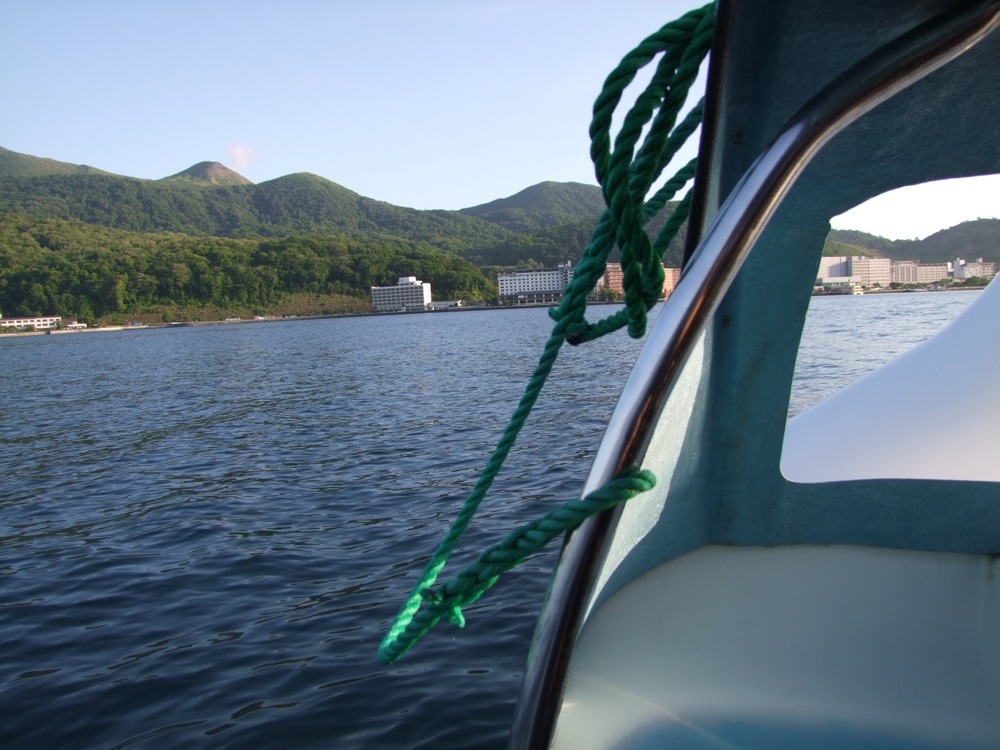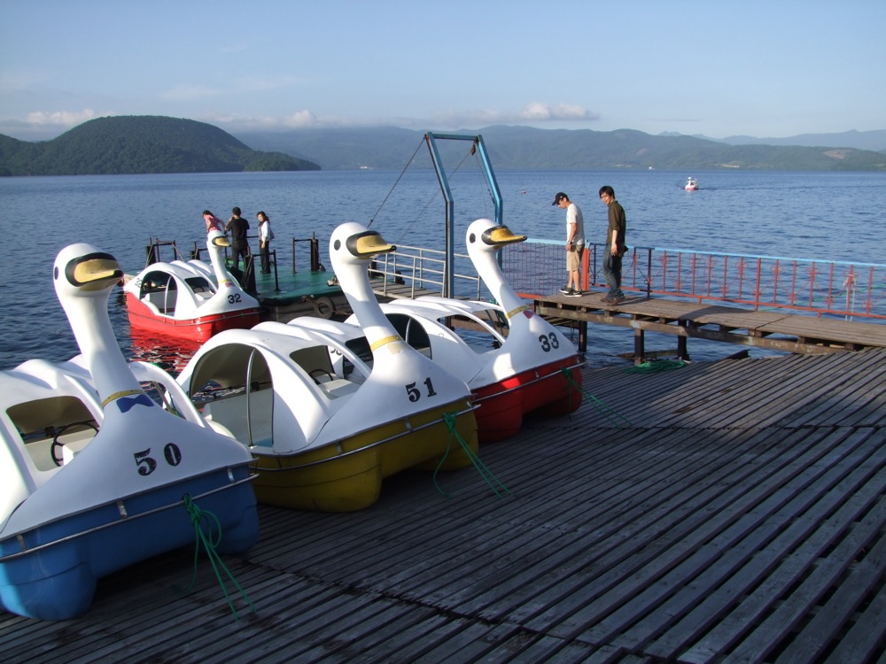洞爺湖はカルデラ湖で、その真ん中には中島が存在します。一見、そこまで簡単にこの白鳥に乗っていけば(現実的には漕いで行けば…笑)着きそうな感じだったのですが、あとで聞くと、その中島までの距離は約3km…。30歳前後の青年が、30分間内で漕いで往復…という希望は呆気無く打ち砕かれました(笑)。構造上、ペダルを漕いでいたのは、年上のトシさんと自分の2人だけだったのが皮肉でしたが(笑)、足が筋肉痛にならない事を祈るばかりです…。