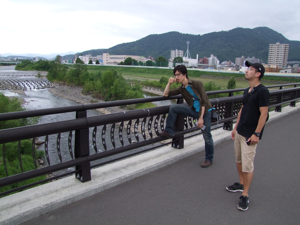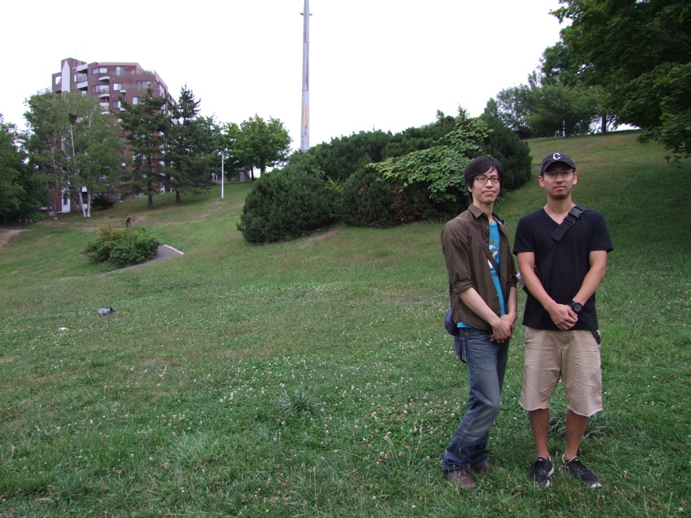 市電を見たり、豊平川を渡ったり、何気ない街をただ歩いたりと、非常に坦々とした道のりが続きましたが(笑)、予想以上にいつの間にか歩きつつ、HTBに着きました。恐らく1時間弱は歩いていたので、若干疲れも出てきてしまっていましたが、テレビ局に近付くにつれて池田君のテンションは上がり、そしてテレビ局の裏に位置する平岸高台公園を目の当たりにした瞬間、そのテンションはマックスに達成しました。